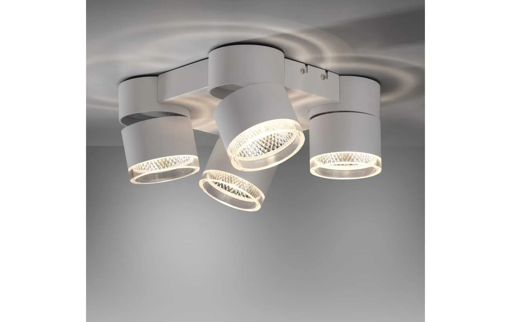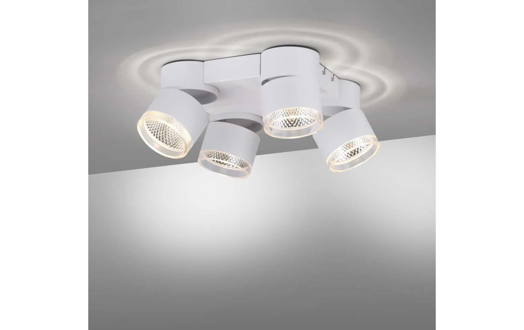 Die Deckenleuchte wird mit vier warmweißen LED Leuchtmitteln geliefert. Jeder Spot ist bis zu 350° drehbar und um 90° schwenkbar.