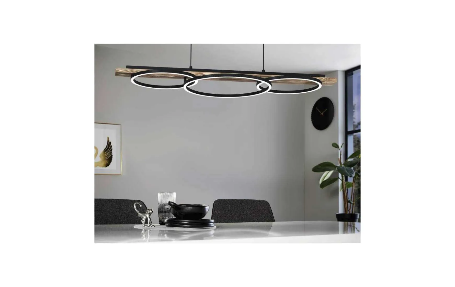 Die LED Pendelleuchte ist aus geflammtem Holz gefertigt und mit drei schwarzen, runden Metall-Profilen kombiniert.