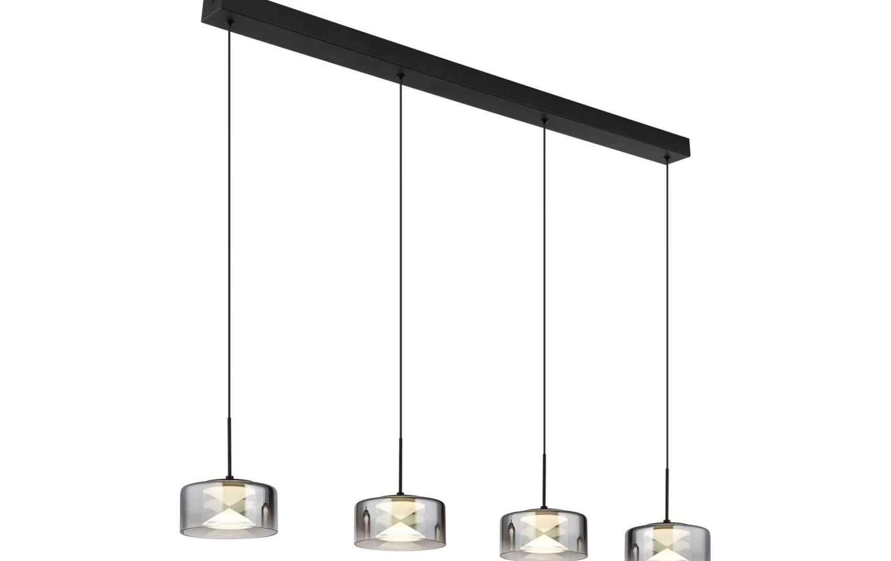 Diese Hängeleuchte mit vier runden Schirmen in rauchfarbenem Glas ist ein modernes Lichtobjekt.
