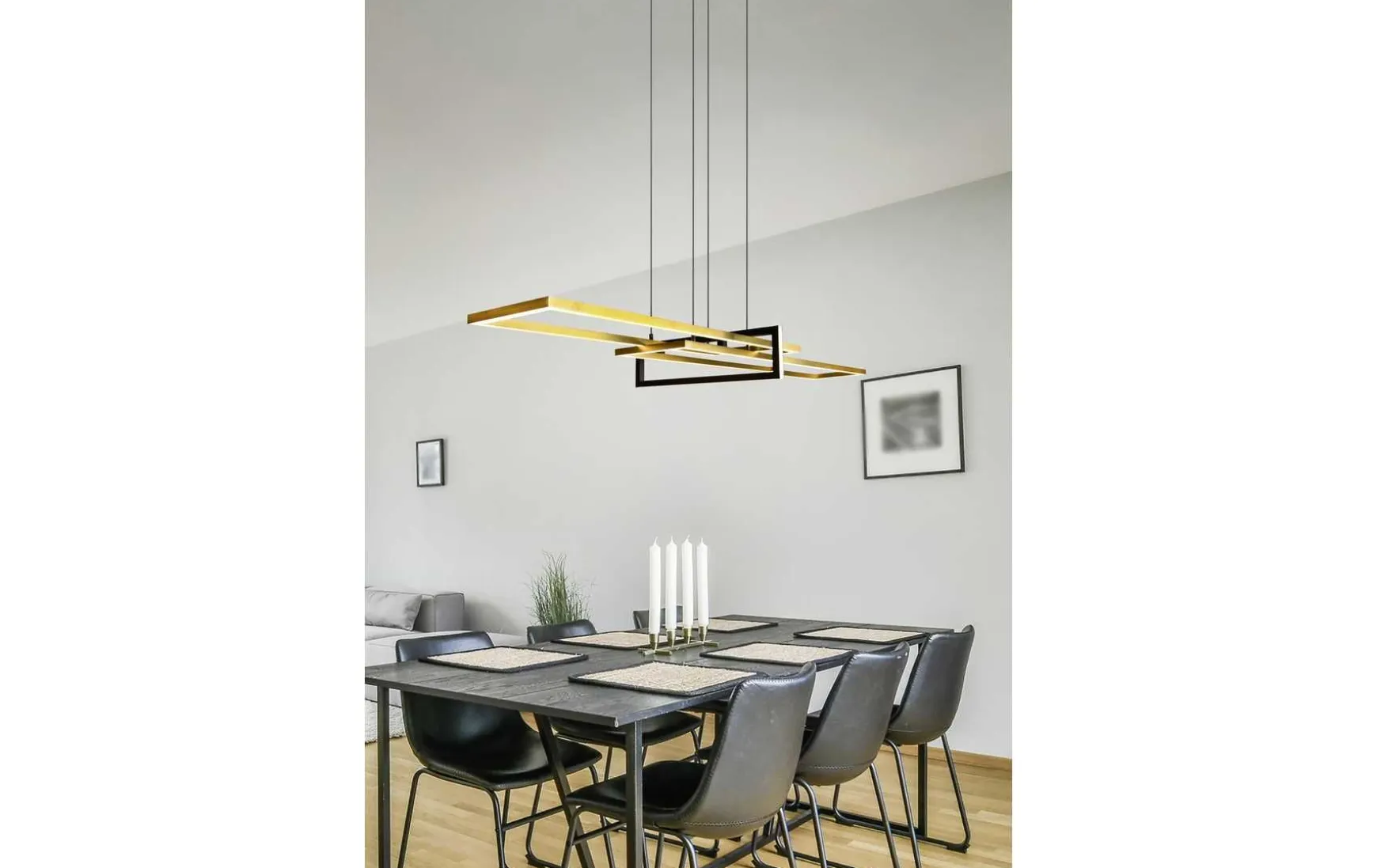 Über dem Esstisch platziert, unterstreicht die Leuchte den modernen Wohnstil und sorgt mit drei unterschiedlich ausgerichteten Lichtelementen für eine angenehme Beleuchtung.