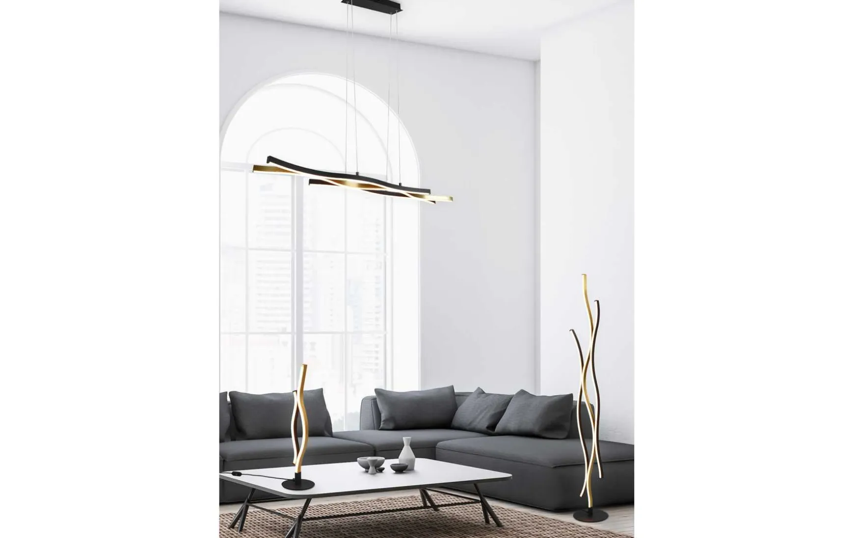 Die schöne geschwungene Form dieser Pendelleuchte setzt Ihren Essbereich gezielt in Szene und wird zudem zu einem besonderen Blickfang über dem Esstisch.