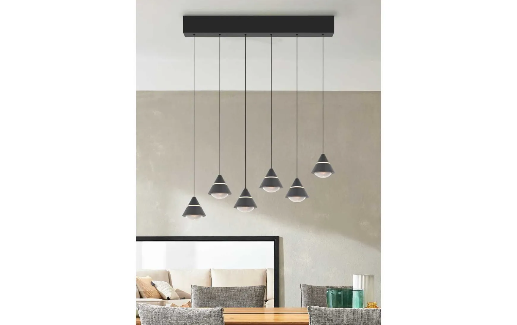 Mit sechs Lichtquellen sorgt die Leuchte für eine ausgewogene, großflächige Beleuchtung – perfekt für Wohn- und Essbereiche mit klarer Gestaltung.