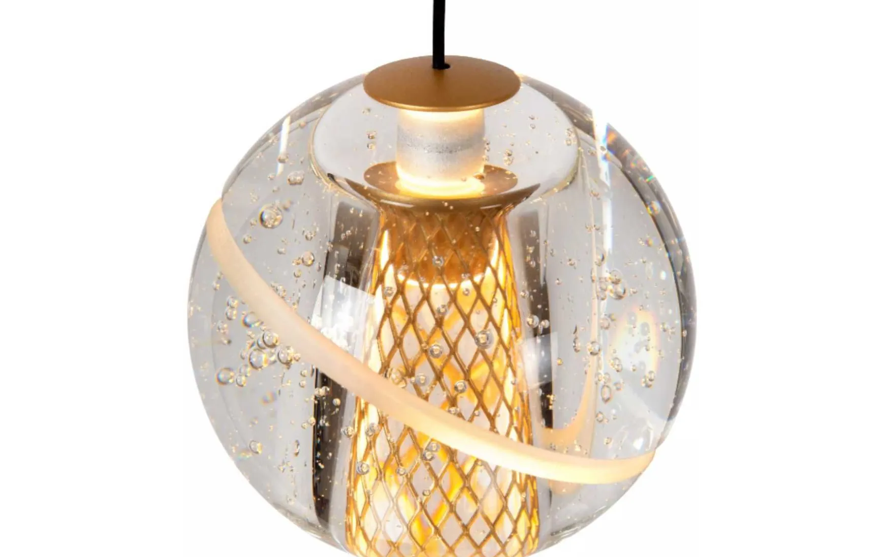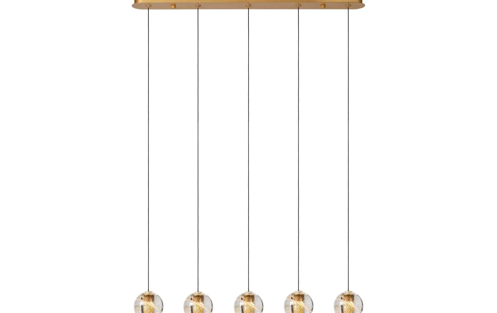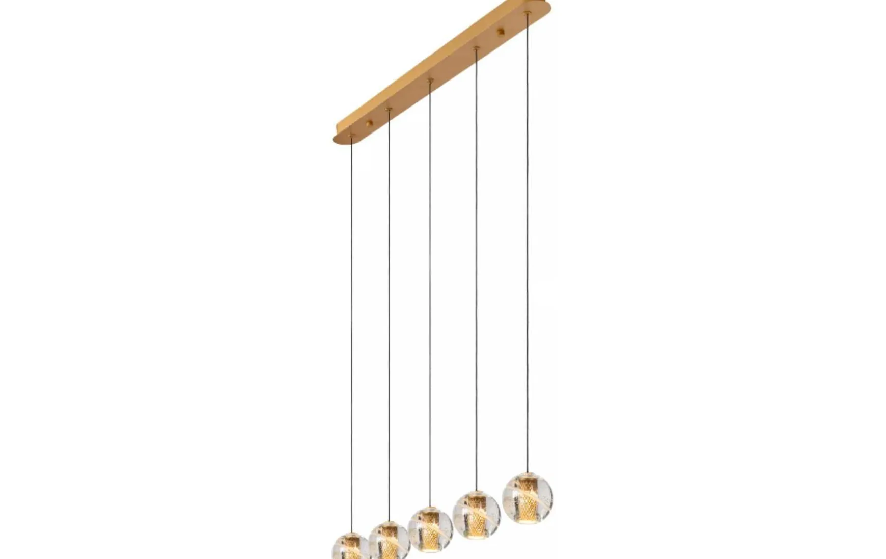 Das Zusammenspiel von Design, Farben und Materialien verleiht dieser Pendelleuchte einen modernen, eleganten Stil. Von der Deckenplatte aus Messing hängen fünf in einer Reihe verlaufende Pendel herab, die Sie leicht in der Höhe verstellen können. Darunter befinden sich minimalistische, kugelförmige Glaslampenschirme mit edlen Details. In ihnen verstecken sich integrierte LED-Lichtquellen, die den Raum mit warmweißem Licht erhellen. Wenn Sie Dilenko an einen Dimmer anschließen, bringen Sie die Atmosphäre auf die nächste Stufe.