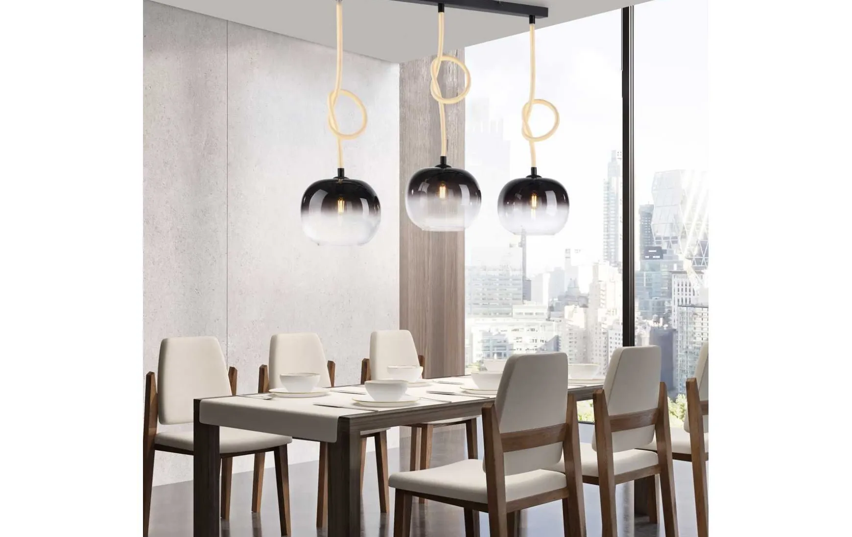 Entdecken Sie die faszinierende Welt des Lichts mit der 3-flammigen LED Pendelleuchte. Mit ihrem modernen Design setzt diese Leuchte neue Maßstäbe in puncto Stil. Die Pendelleuchte besticht durch ihr elegantes schwarzes Finish, das jedem Raum eine edle Note verleiht. Das Besondere an dieser Leuchte sind die beleuchteten Seile, das sie umgibt. Die sanft schimmernde Seile erzeugt eine einzigartige Atmosphäre und setzen einen modernen Akzent in Ihrem Wohnbereich. Die drei Rauchgläser der Leuchte sorgen für eine blendfreie und angenehme Lichtverteilung. Das Licht wird sanft gestreut, wodurch ein harmonisches und stimmungsvolles Ambiente entsteht. Die Leuchte verfügt über zwei verschiedene Lichtquellen, die unabhängig voneinander geschaltet werden können. So haben Sie die Möglichkeit, die Beleuchtung individuell an Ihre Bedürfnisse anzupassen. Ein weiteres Highlight der Pendelleuchte ist die flexible Abhängung. Durch das Verknoten der Seile kann die Abhängung variiert werden. Sie bietet Platz für eine drei herkömliche E27-Glühbirne mit jeweils eine maximalen Leistung von 40 Watt sowie drei integrierte LED Boards. Dadurch erhalten Sie eine helle und effiziente. Beleuchtung, die gleichzeitig Energie spart. Tauchen Sie Ihre Räume in ein faszinierendes Lichtspiel und schaffen Sie eine einladende Atmosphäre.