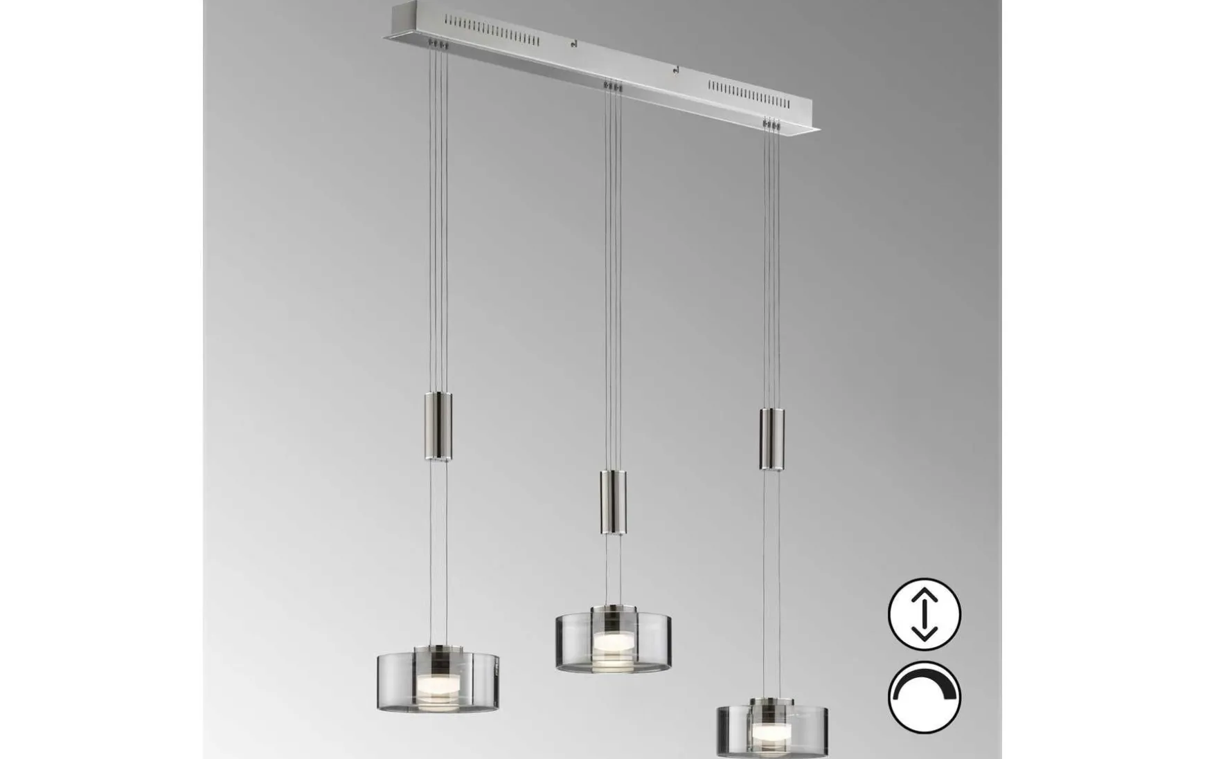 Die matt-nickelfarbene Aufhängung aus Metall und das rauchfarbene Glas verleihen dieser Leuchte eine einzigartige Optik, die ein wahrer Blickfang ist und jeden Raum visuell aufwertet.