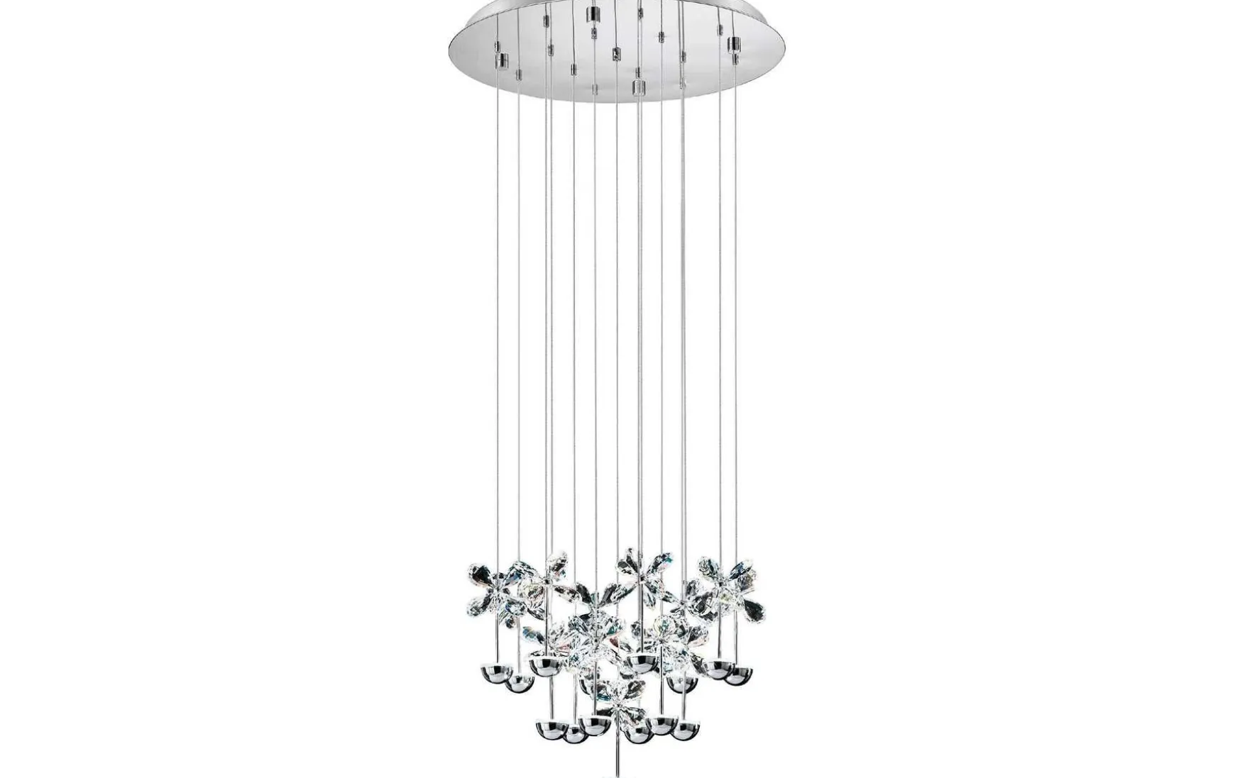 Diese Pendelleuchte ist aus chromfarbenem Edelstahl mit einer Vielzahl an klaren Brillantglas-Elementen, die an Blüten erinnern, gefertigt.