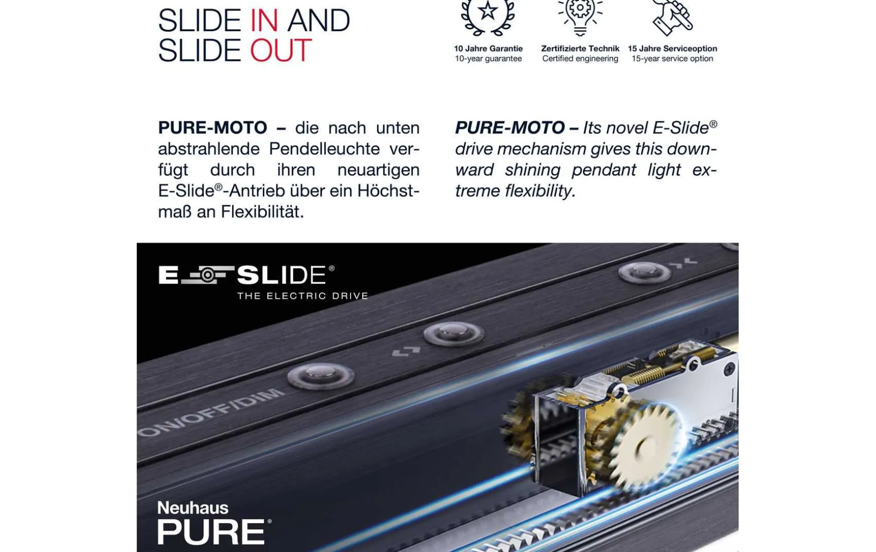 Die Messing mattfarbene LED Pendelleuchte überzeugt mit einer besonderen Funktionalität. Die nach unten strahlende Pendelleuchte verfügt durch ihren neuartigen e-SLIDE® -Antrieb über ein Höchstmaß an Flexibilität. Mittels Funk-Fernbedienung oder über die Sensortasten an der Oberseite des Leuchtbalkens lässt sich die Leuchte elektrisch betrieben in Ihrer Ausdehnung von 120,0 – 200,0 cm strecken bzw. zusammenschieben. Die PURE-MOTO verfügt über eine stufenlose CCT-Lichtsteuerung von warmweiß (2700K) bis neutralweiß (5000K). Diese Steuerung erfolgt ebenfalls über die Fernbedienung oder über die Sensortasten der Touchfläche. Dank der Memoryfunktion bleiben die zuletzt gewählten Einstellungen immer so lange erhalten bis man eine neue Einstellung vornimmt. Das alles macht die Leuchte zu einer besonderen Attraktion über ausziehbaren Esstischsituationen. Die Höhe der Pendelleuchte kann nach Wünschen auch eingestellt werden.