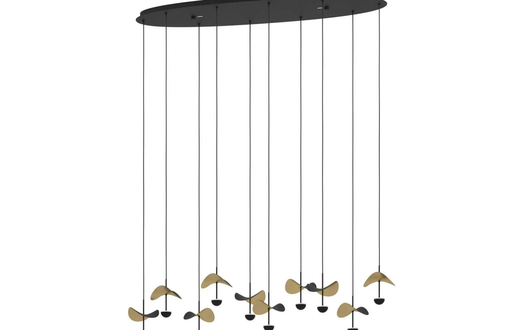 Diese LED-Leuchte ist aus schwarzem Metall mit einer Vielzahl an goldfarbenen Elementen, die an Blätter erinnern, gefertigt.
