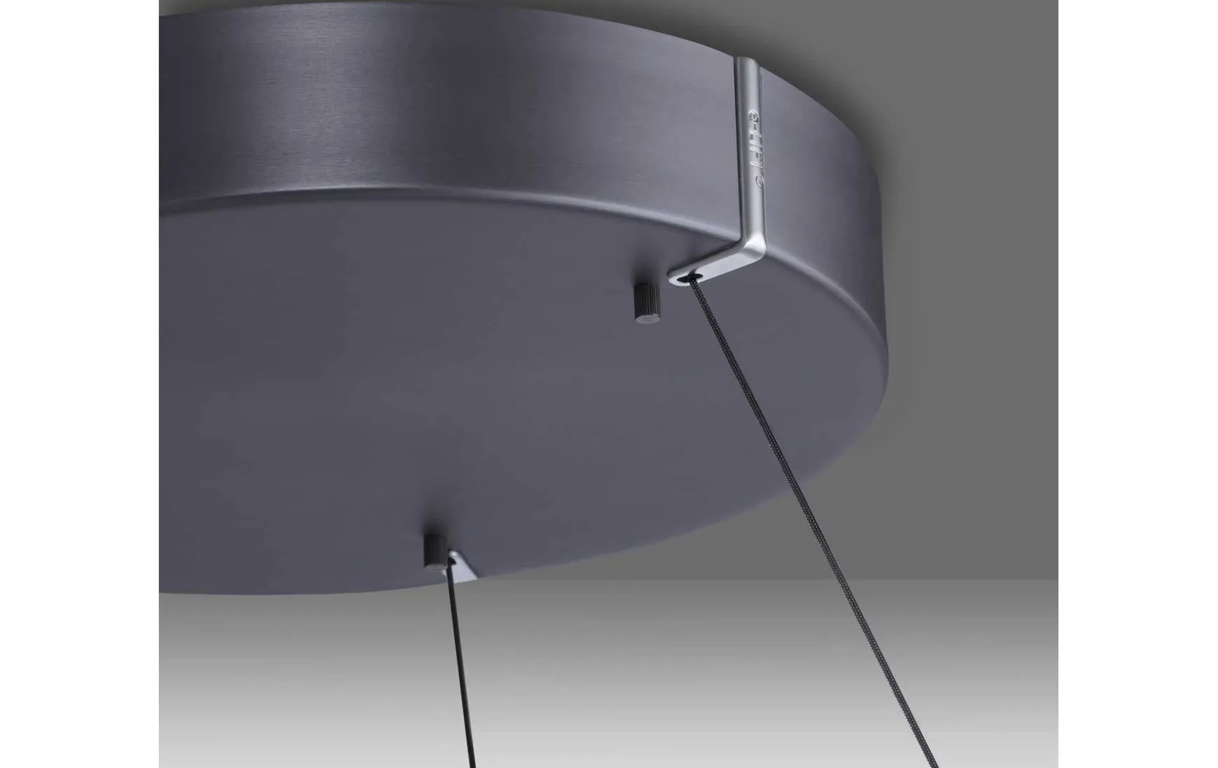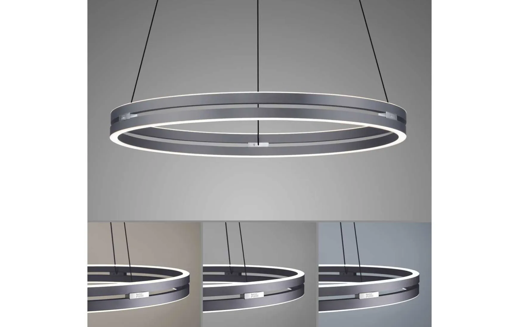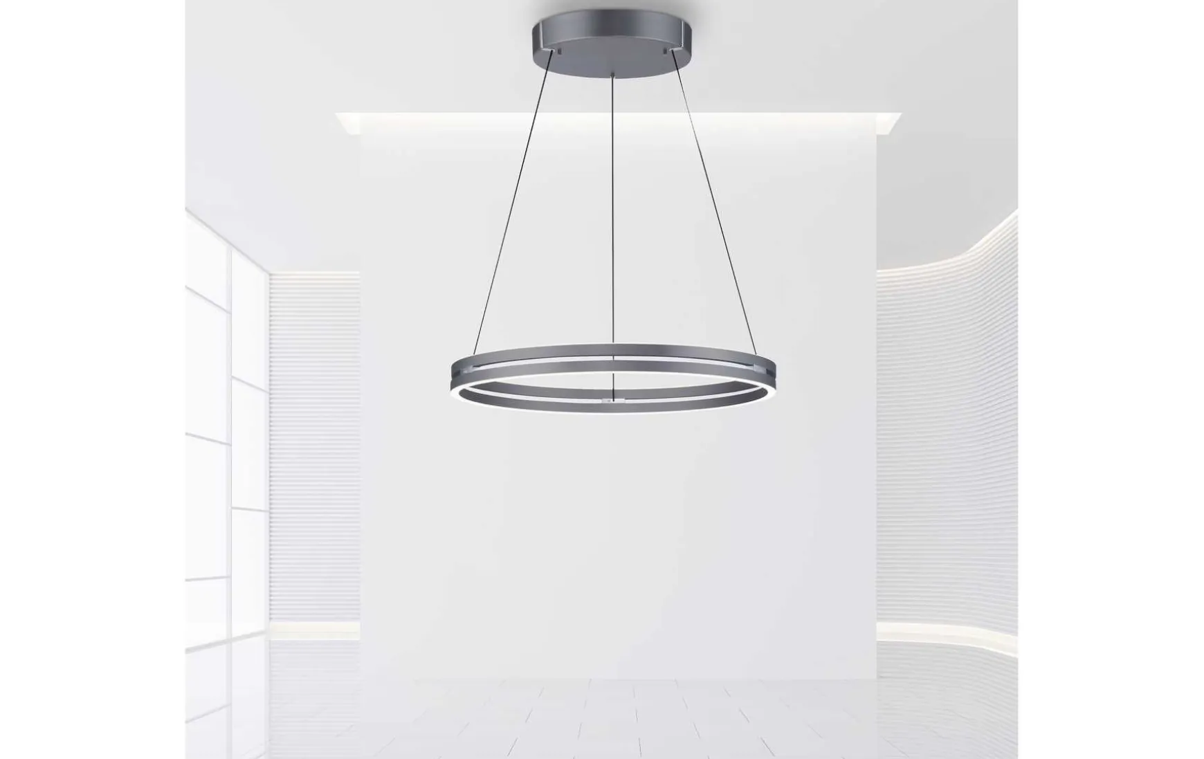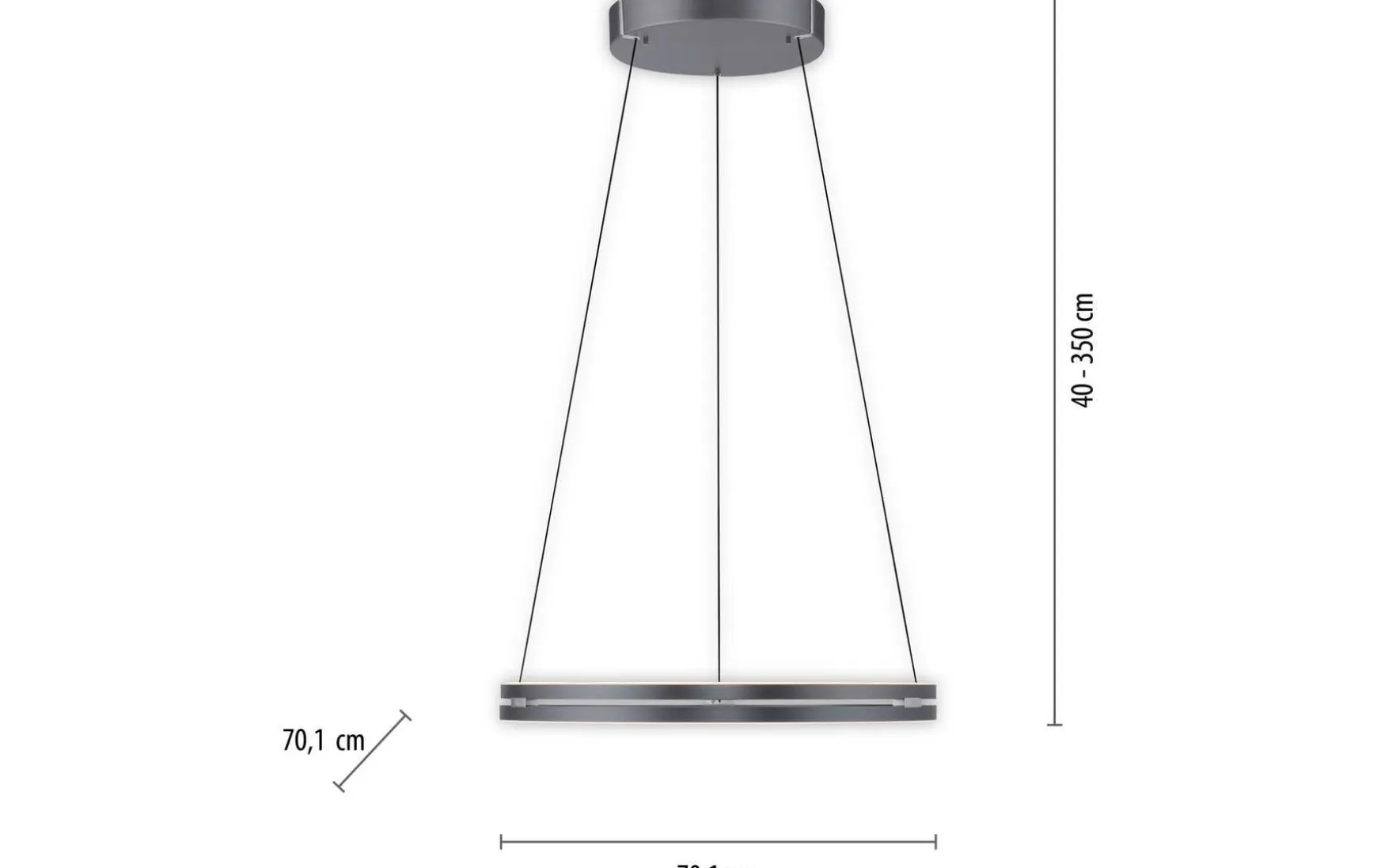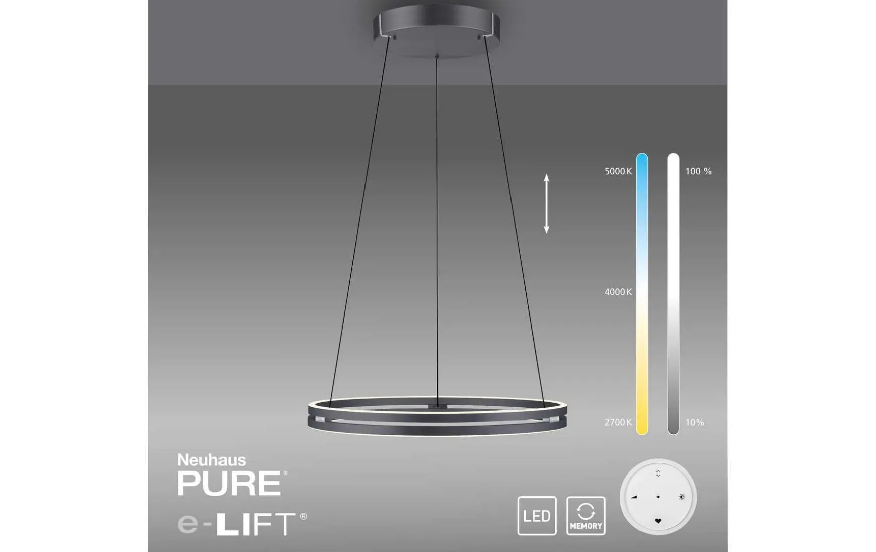 Diese Pendelleuchte verfügt über einen motorisierten Aufzug, der die Leuchte über die mitgelieferte Fernbedienung stufenlos von 60 auf 240 cm in die Höhe heben kann. Sie können auch alle Funktionen der Lampe mit derselben Fernbedienung steuern – LED-Licht sowohl an der Ober- als auch an der Unterseite der Lampe. Sie verfügt über eine einstellbare Dimmung, bei der die Lichtfarbe zwischen 2700 und 5000 Kevin geändert werden kann.