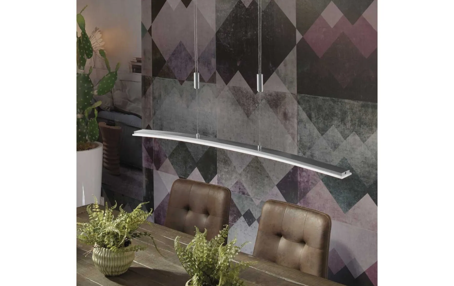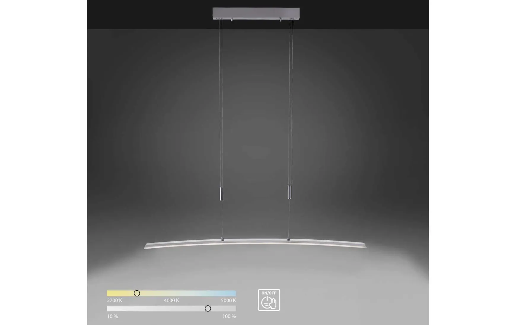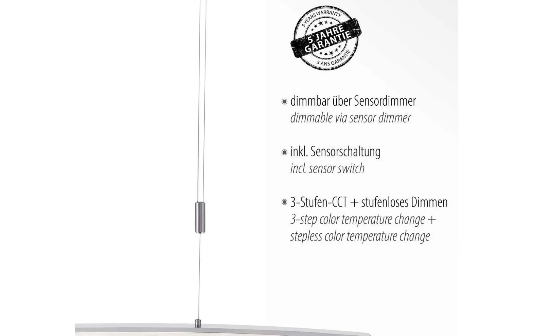Ein zeitloser Hingucker: Die LED Pendelleuchte überzeugt durch ihr elegantes und schlichtes Design. Die gebogene Leuchte sieht aber nicht nur gut aus, in ihr steckt auch eine Menge Funktion! Durch das integrierte 3-Stufen-CCT-Lichtmanagement kann die Hängelampe in der Farbtemperatur von 2.700 Kelvin (warmweiß) über 3.800 Kelvin (neutralweiß) bis 5.000 Kelvin (kaltweiß) nach Belieben über einen verbauten Sensor verstellt und in der Helligkeit gedimmt werden. Das Ein- und Ausschalten der Leuchte ist ebenso über einen Sensorschalter möglich, was besonders praktisch ist, da man sich dadurch den Weg zum Wandschalter ersparen kann. Durch die vorhandene Memoryfunktion bleibt die zuletzt gewählte Einstellung solange erhalten, bis man eine neue Einstellung vornimmt. Das Pendel ist mit einem Seilzug ausgestattet, welcher es Ihnen ermöglicht, die Leuchte in der Höhe von 100 – 180 cm mit wenigen Handgriffen zu regulieren. Besonders gut eignet sich die Pendelleuchte zur Nutzung über dem Esstisch. Durch die verbaute LED Technik ist die Leuchte besonders energieeffizient und zeichnet sich somit durch einen geringen Energieverbrauch aus.