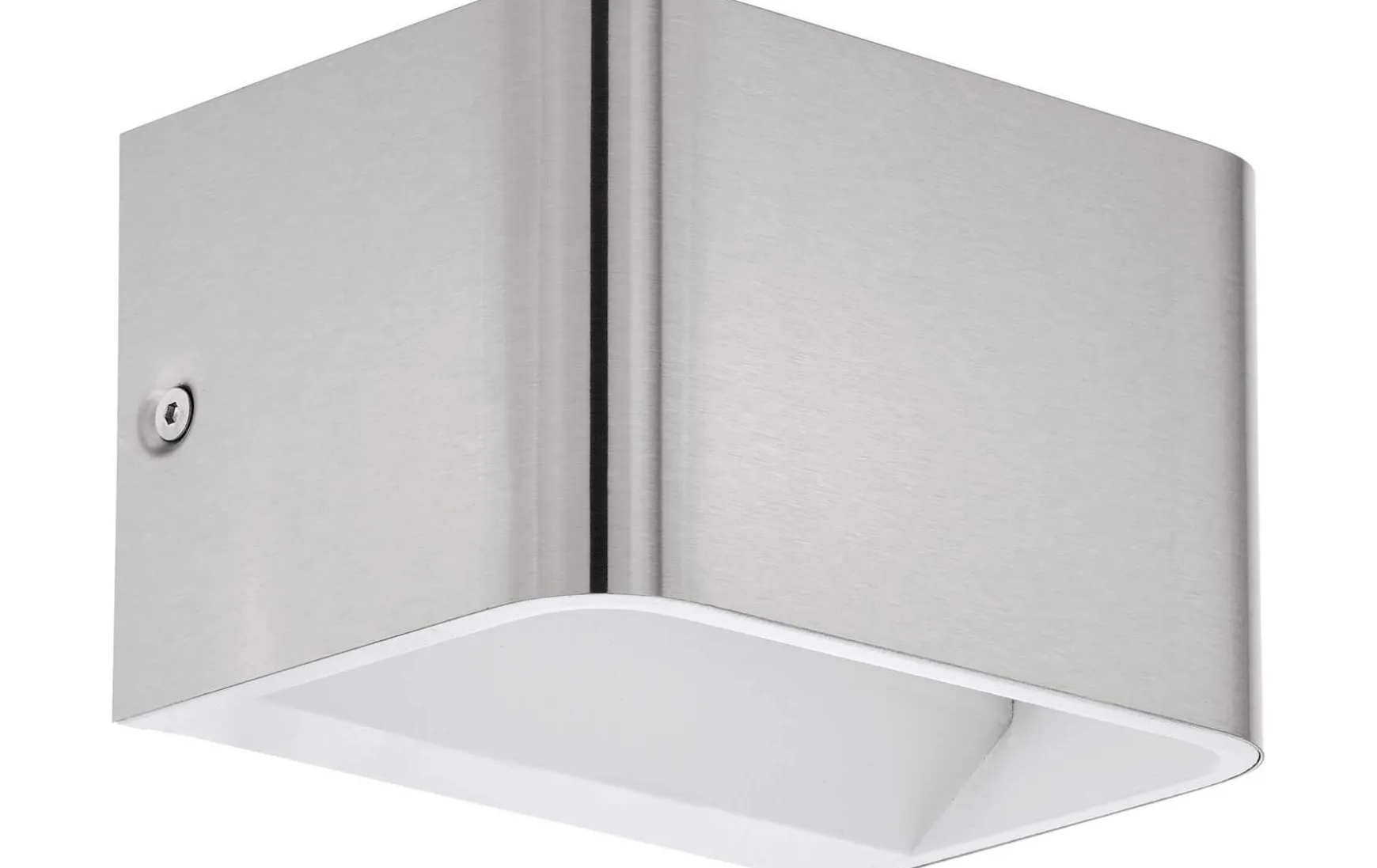 Diese LED Wandleuchte besteht aus einem quaderförmigen Leuchtenkörper, der aus Alu in Nickel-Matt mit weißer Innenseite gefertigt ist.