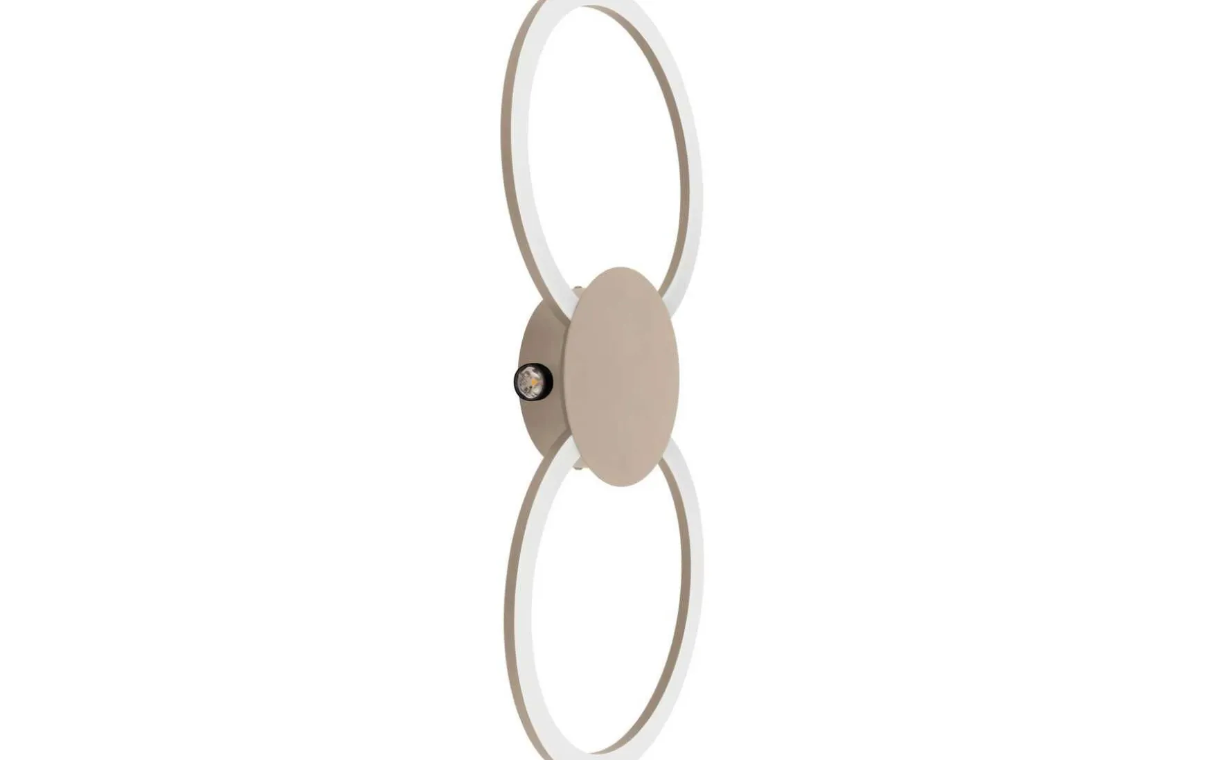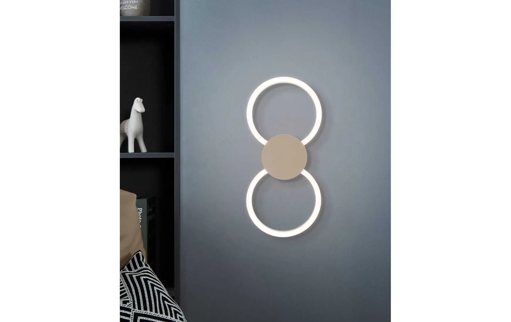 Zwei schlanke Leuchtringe sind vertikal an einem runden Wandmodul in matter Sandoptik montiert und erzeugen gemeinsam eine ausgewogene Lichtkomposition.