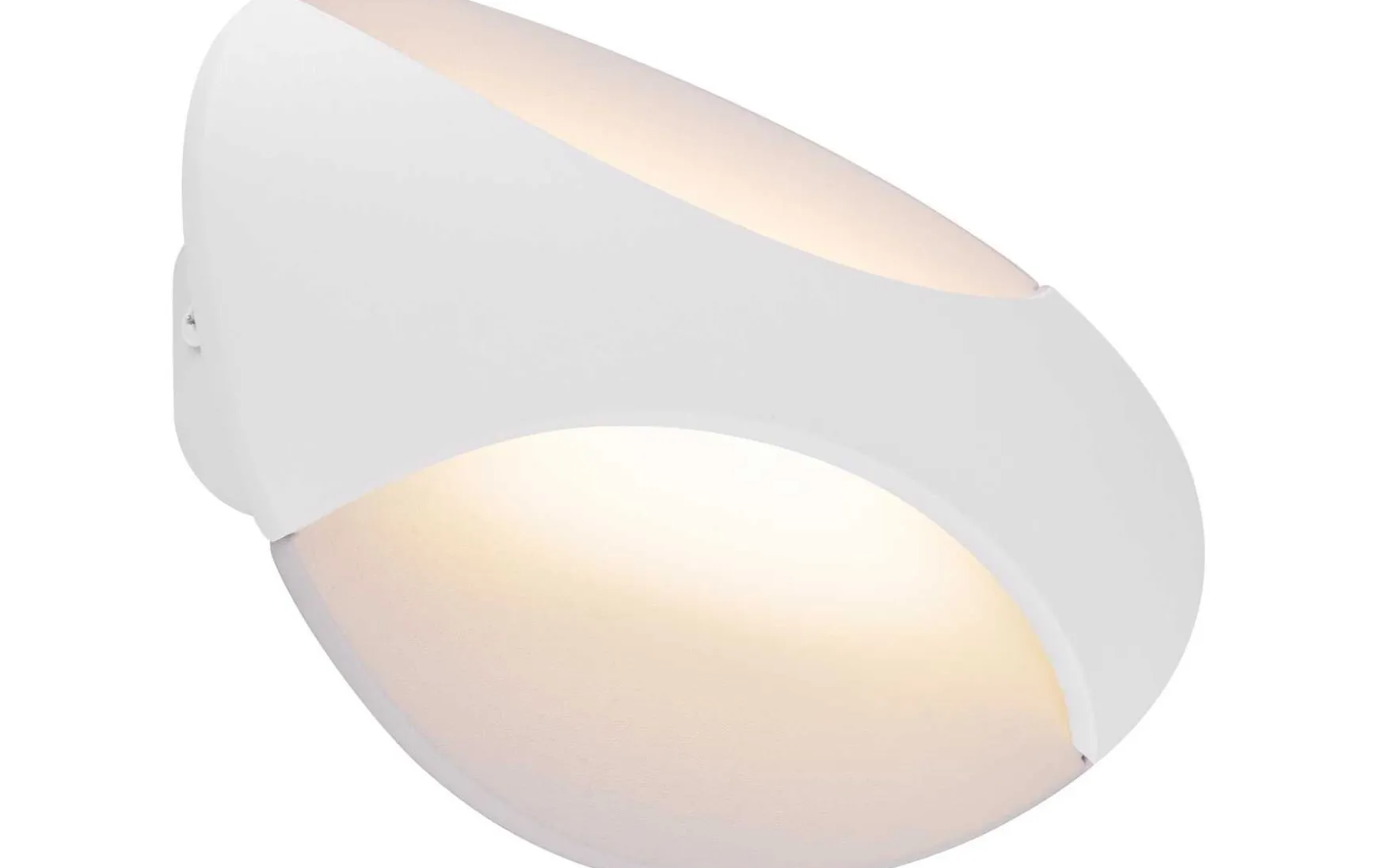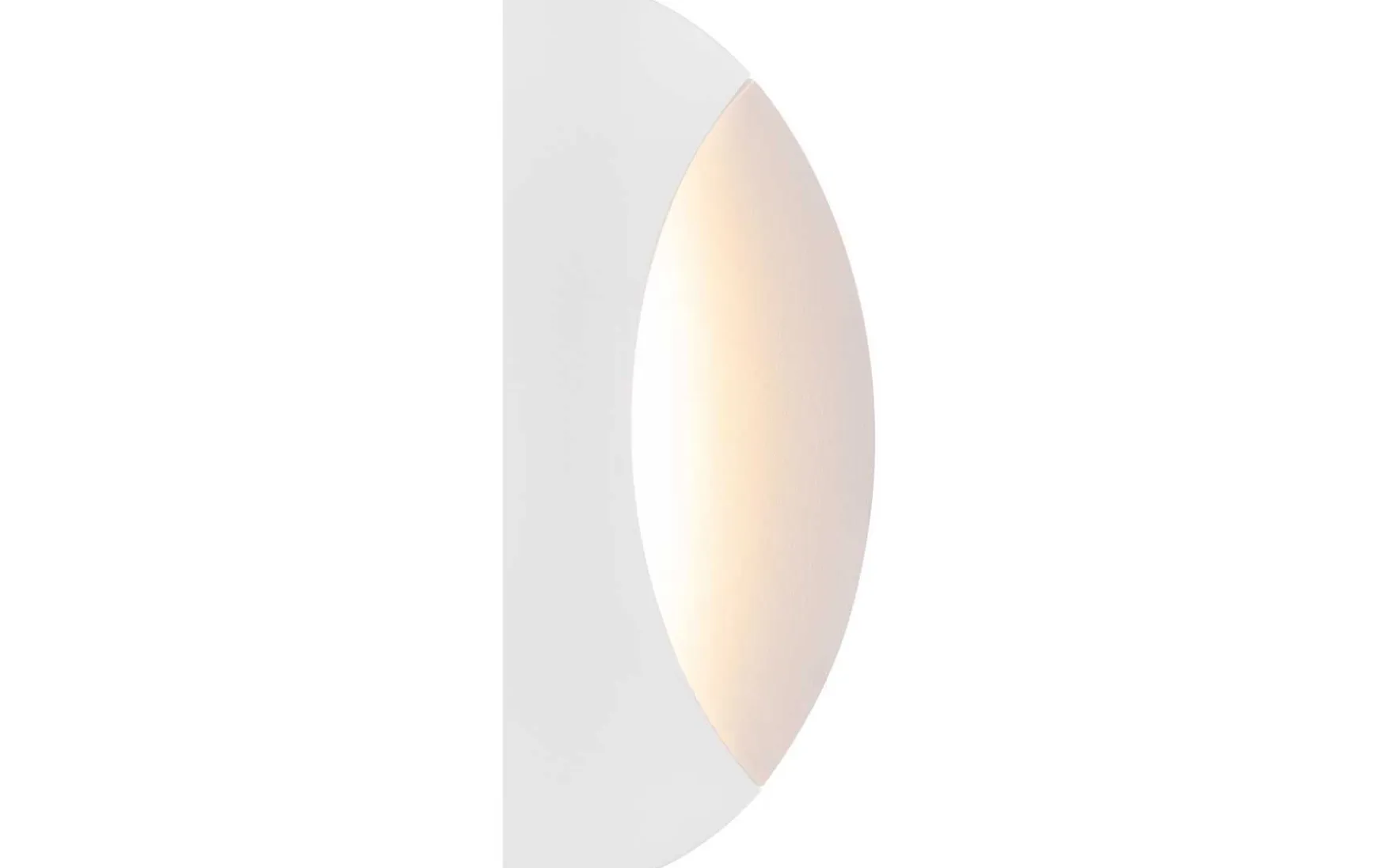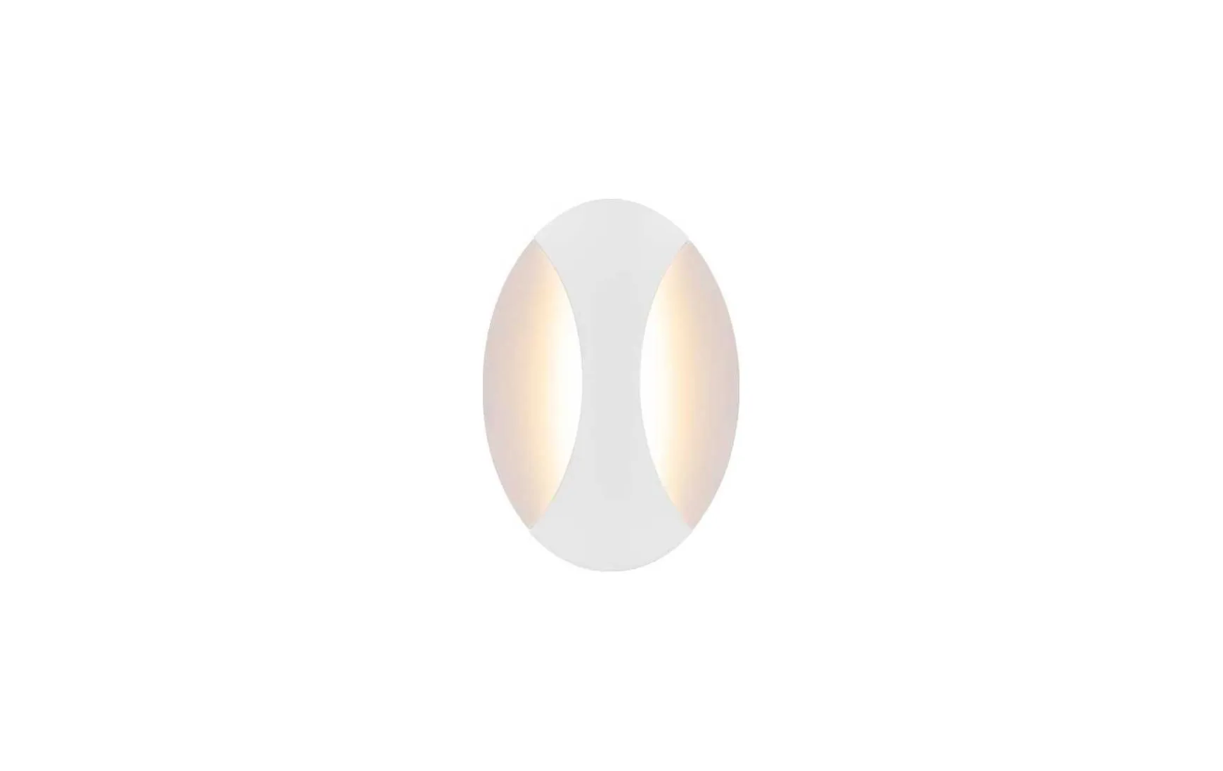 Die ovale Wandleuchte aus weißem Metall besticht durch ihre Rundungen.