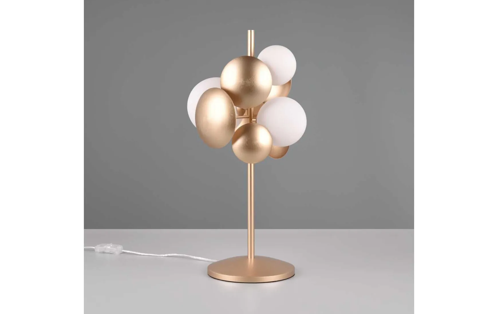 Diese Leuchte setzt bemerkenswerte Akzente mit Wow-Effekt in Ihrem Wohnbereich. Die Tischleuchte entfaltet ihre außergewöhnliche Wirkung besonders eindrucksvoll auf einem Nachttisch oder einer Kommode und spielt, dank ihres unverwechselbaren Designs, mit Licht und Schatten. Die Leuchte ist mit einem Schnurschalter ausgestattet, wodurch sie leicht ein- und ausschaltbar ist. Die einzigartige Gestaltung der Leuchte wird durch die Materialkombination von weißem Glas und goldfarbenem Metall betont.