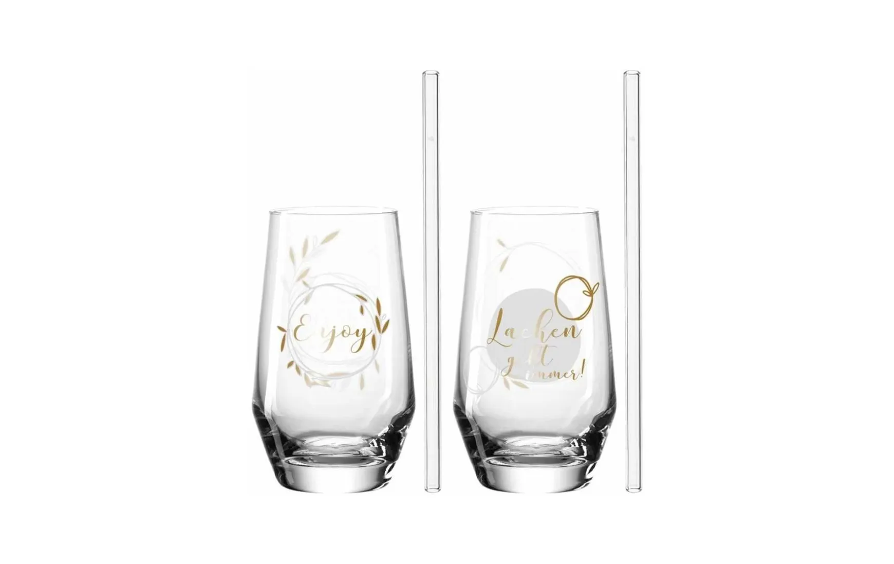 Diese zwei Trinkgläser mit dem Spruch ‚Enjoy‘ und ‚Lachen geht immer‘ inklusive Glastrinkhalme sind in der originellen Geschenkverpackung eine großartige Geschenkidee. Die Trinkgläser sind optimal als Geburtstagsgeschenk für Ihre Freundin oder Freund. Geschenke, die ohne viele Worte Ihre Liebe zeigen. Das Bar-Glas ist für klassische Longdrinks und Cocktails ebenso optimal geeignet, wie für alkoholfreie Getränke. Das Teqton-Glas garantiert dauerhafte Brillanz und Transparenz und ist somit langanhaltend kristallklar. Sie sind spülmaschinengeeignet und somit besonders praktisch im Alltag. Das Set besteht aus 2 Trinkgläsern mit 2 Glastrinkhalmen.