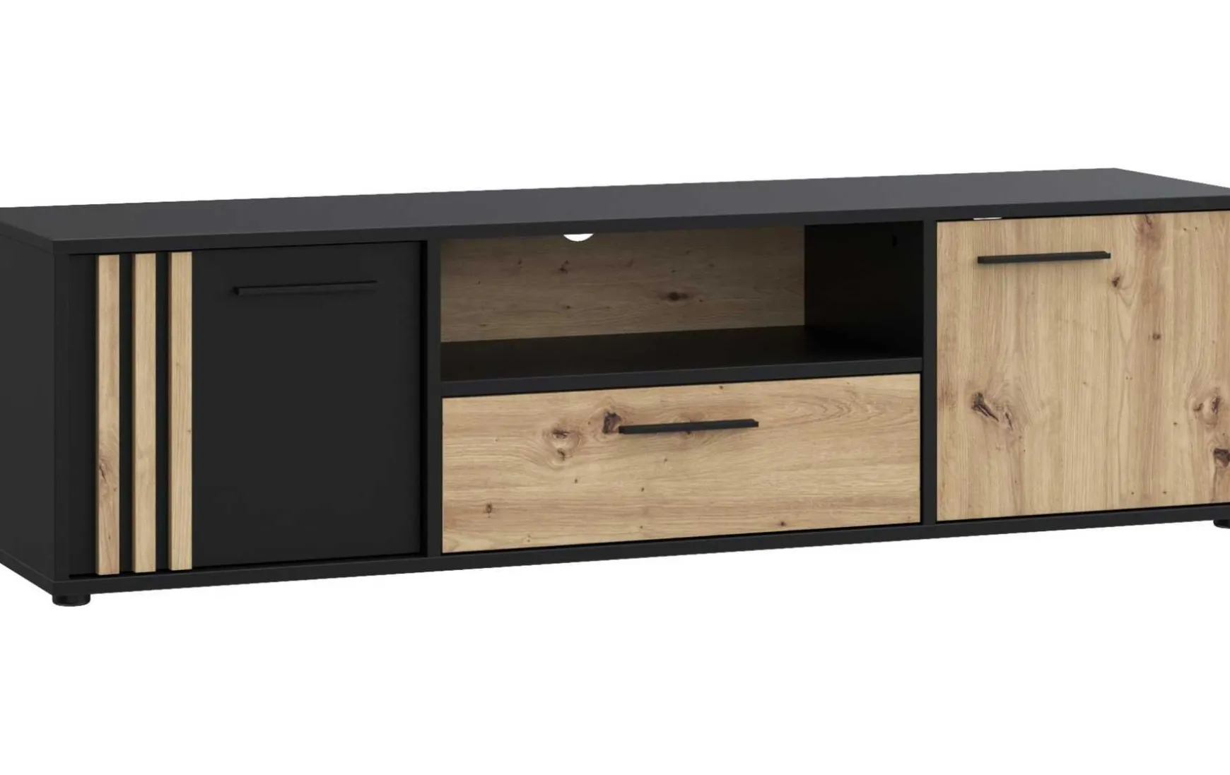 Dieses TV-Lowboard in Artisan Eiche NB vereint modernes Design mit funktionaler Aufbewahrung und ist ideal für Wohnzimmer oder Medienbereiche. Die Kombination aus warmer Holzoptik und schwarzen Griffen und Füßen sorgt für einen zeitgemäßen, stilvollen Look, der sich harmonisch in verschiedene Einrichtungskonzepte einfügt. Mit den Maßen von ca. 142,6 × 41,5 × 43,9 cm (B/T/H) bietet das Lowboard ausreichend Platz für Fernseher, Multimedia-Geräte und Dekoration. Es verfügt über zwei Drehtüren, eine Schublade und ein offenes Fach, die Stauraum für Zubehör, Medien oder persönliche Gegenstände bieten. Gefertigt aus robuster Artisan Eiche NB mit pflegeleichten Oberflächen, ist das Möbelstück langlebig und einfach zu reinigen. Das Lowboard wird zerlegt geliefert und lässt sich unkompliziert montieren.