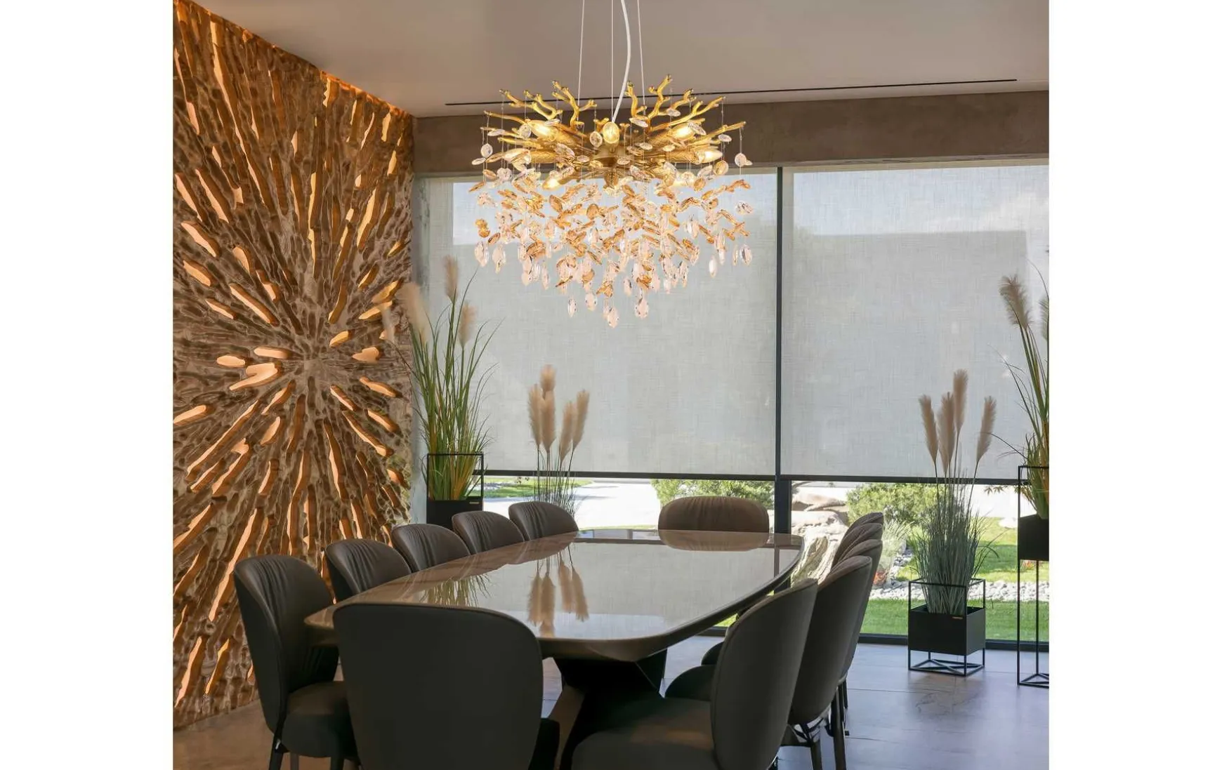 Dieser runde Luster mit edlem Kristallbehang begeistert mit einem eleganten Design und detailreicher Verarbeitung. Der fein verzweigte Korpus aus matt goldfarbenem Metall erinnert an ein stilisiertes Geäst und verleiht dem Luster eine natürliche, zugleich luxuriöse Anmutung. Verziert mit Glaskristallen in Amber und Klar entsteht ein faszinierendes Spiel aus Licht, Farbe und Reflexion – perfekt für ein stimmungsvolles Ambiente in Wohn- oder Essbereichen. Die integrierten Flexo-Elemente an den Fassungen ermöglichen eine individuelle Ausrichtung der Lichtquellen für gezielte Lichtakzente. Der Lsuter verbindet stilvolle Optik mit Funktionalität und wird zum funkelnden Mittelpunkt jedes Raumes. Der Luster ist mit mehreren E14-Fassungen ausgestattet, die Ihnen Freiraum bei der Wahl der Leuchtmittel lassen. Leuchtmittel E14 sind nicht enthalten.