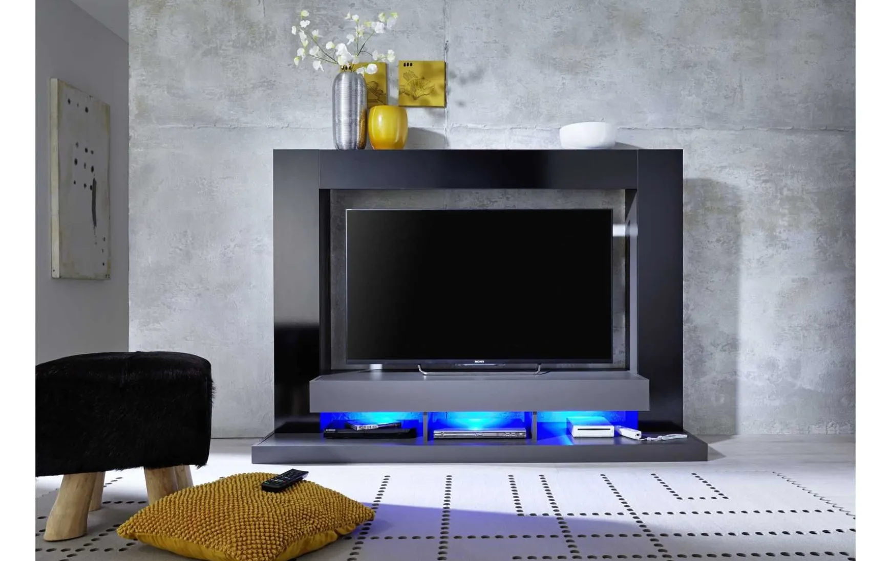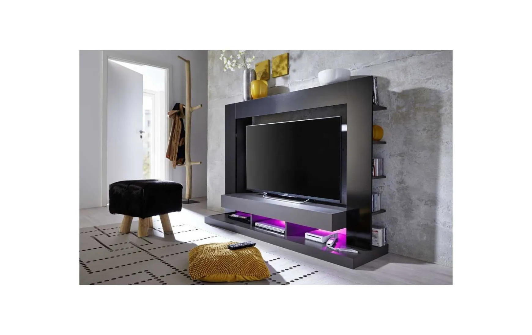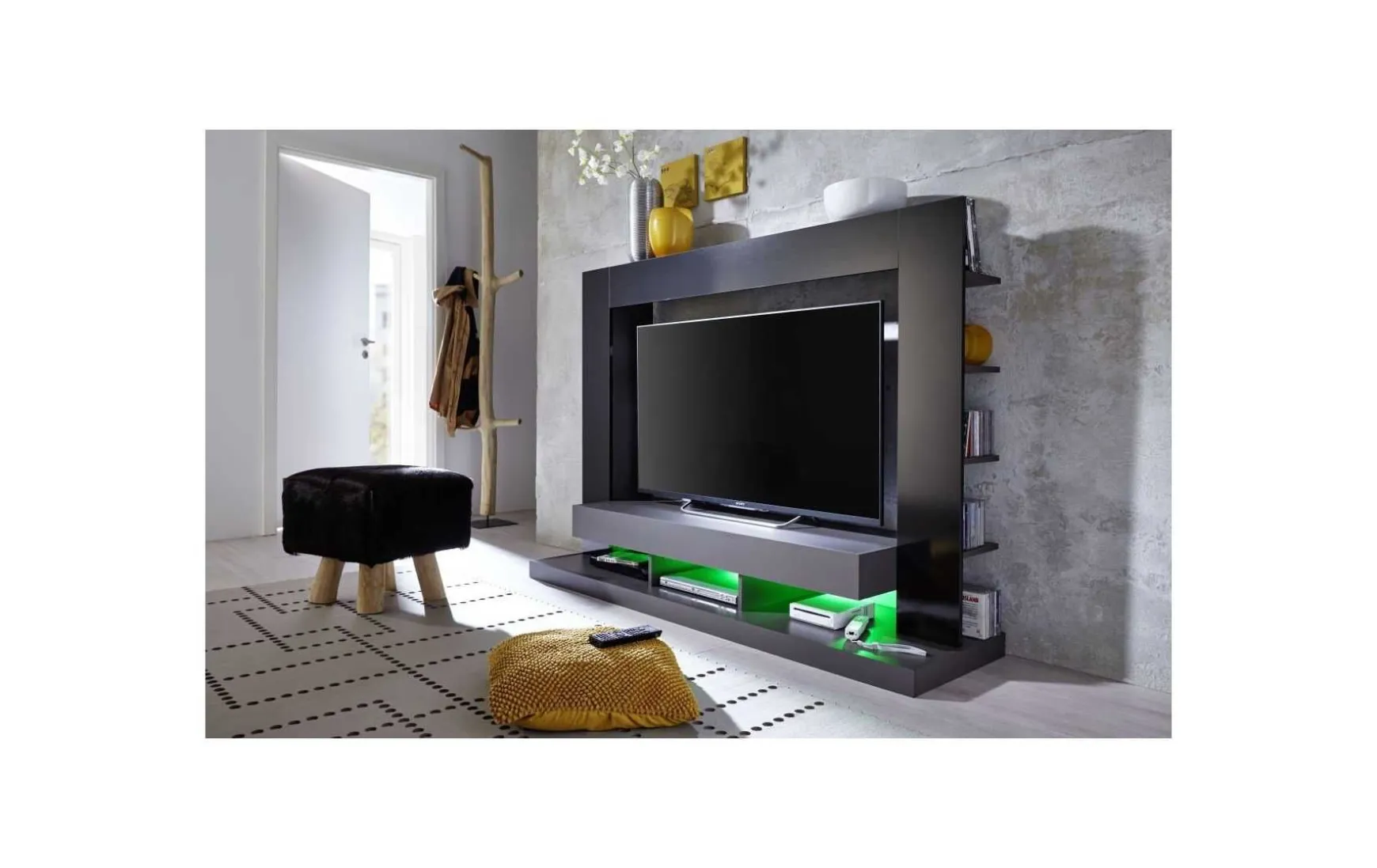 Die Mediawand ist ein modernes und stilvolles Möbelstück, das mit einem jungen Design und hochwertiger Verarbeitung überzeugt. Die Wand kombiniert praktische Funktionen mit ästhetischem Flair und ist ideal für das Wohnzimmer oder andere Wohnräume geeignet. LED-Unterbauspot mit Farbwechsellicht: Die Mediawand verfügt über integrierte LED-Leuchten mit Farbwechsel-Option, die das Ambiente nach Belieben anpassen. Ideal für eine stimmungsvolle Beleuchtung, die sich je nach Bedarf von warmem Licht zu kühleren Tönen verändern lässt.