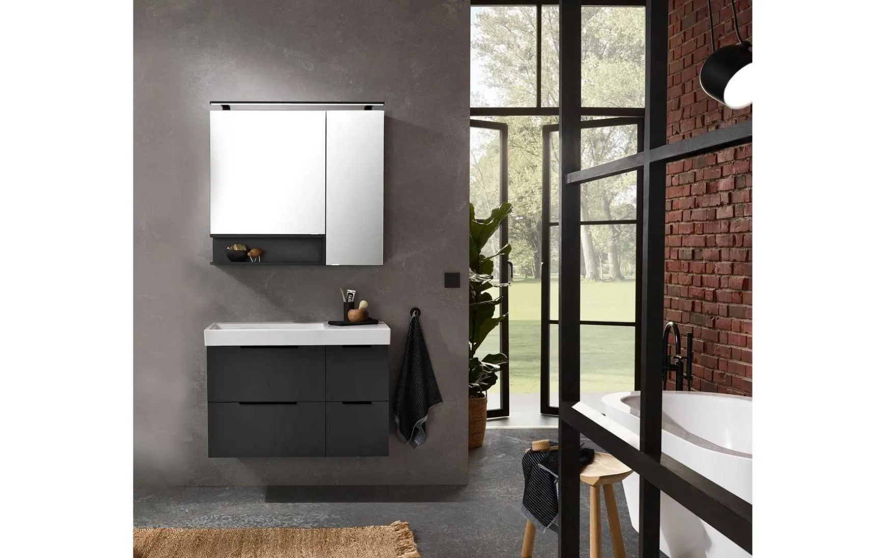 Der Spiegelschrank verfügt über eine Doppelspiegeltür und ein bündiges Regal, das links offen ist (Maße: ca. 60 × 80 × 15 cm), und bietet zusätzlichen Stauraum für Badutensilien. Abgerundet wird die Ausstattung durch eine LED-Aufbauleuchte in mattem Schwarz, die für angenehmes Licht sorgt. Die Gesamtbreite der Kombination beträgt ca. 90 cm, wodurch sie platzsparend und zugleich funktional ist.