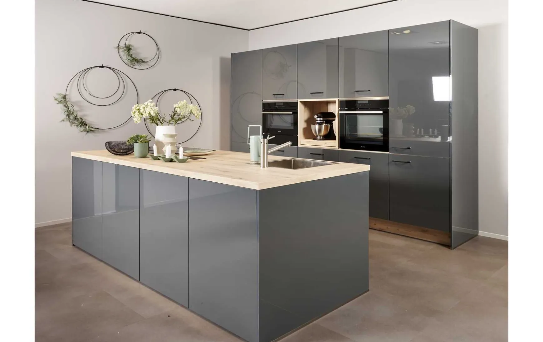 Elegante Einbauküche in Lack Onyx grau Hochglanz kombiniert mit Eiche hell Nachbildung, ca.304+244x96cm. Elektrogeräte, Spüle und Armatur gegen Mehrpreis erhältlich. Andere Größen und Zusammenstellungen zum individuellen Preis planbar.