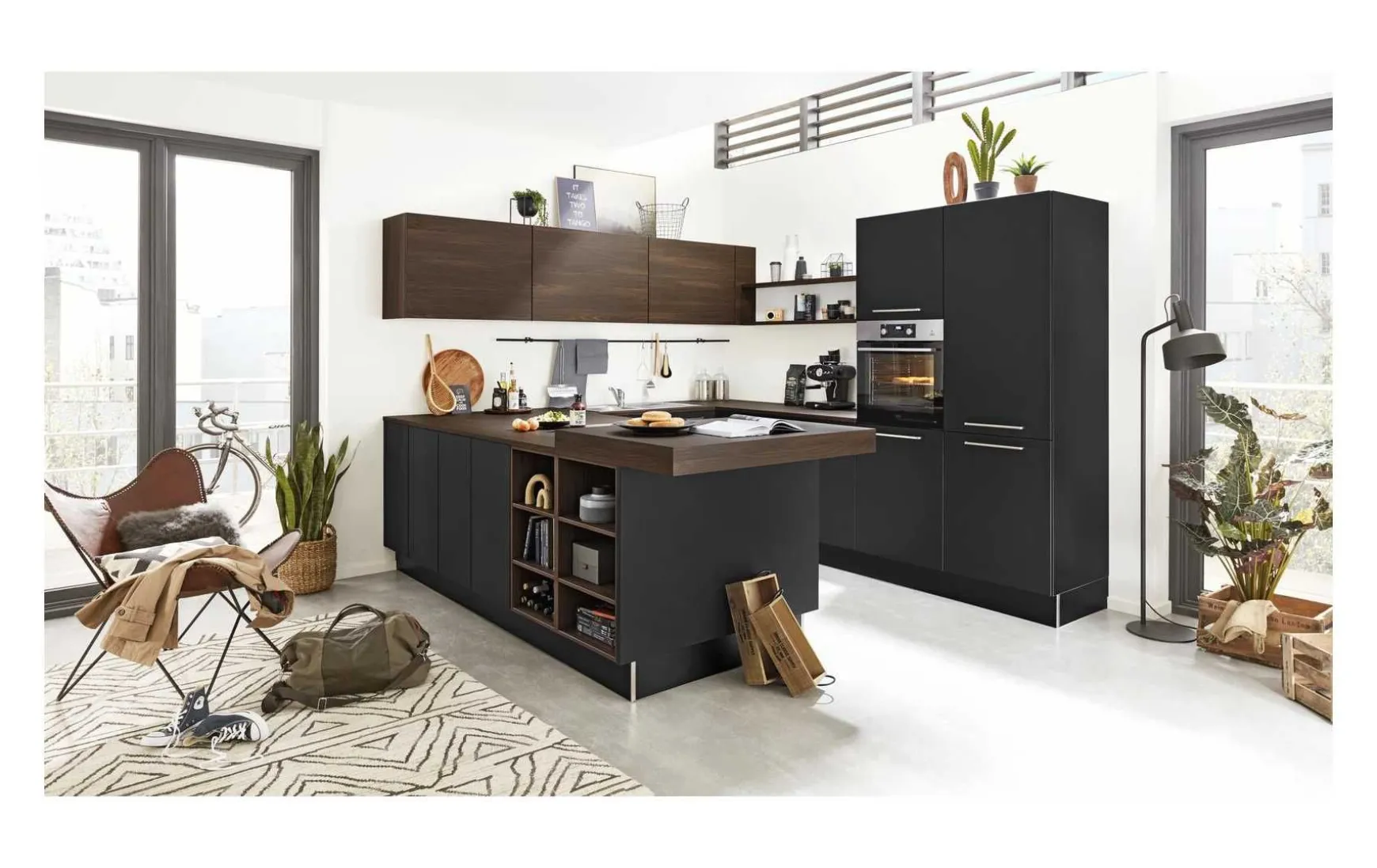 Topmoderne Einbauküche in schwarz softmatt kombiniert mit Nussbaum Nachbildung, ca. 275x270x305cm. Elektrogeräte, Relingset, Stehlampe, Sessel, Einbauspüle und Armatur gegen Mehrpreis. Andere Größen und Zusammenstellungen zum individuellen Preis planbar.