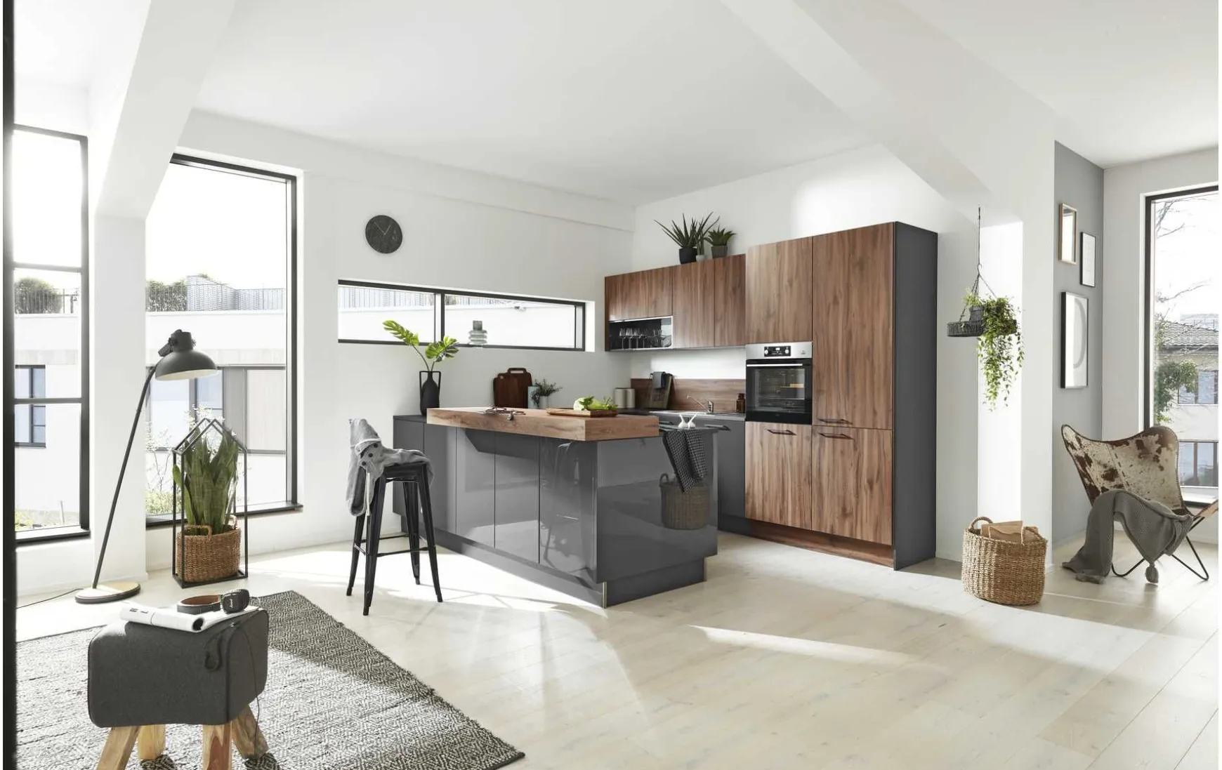 Topmoderne Einbauküche in Echtlack graphit Hochglanz kombiniert mit Hängeschränke, Hochschrank und Thekenplatte in Eiche Sierra Nachbildung, ca. 275 x 280 x 315 cm. Elektrogeräte, Hocker, Einbauspüle und Armatur gegen Mehrpreis. Andere Größen und Zusammenstellungen zum individuellen Preis planbar.
