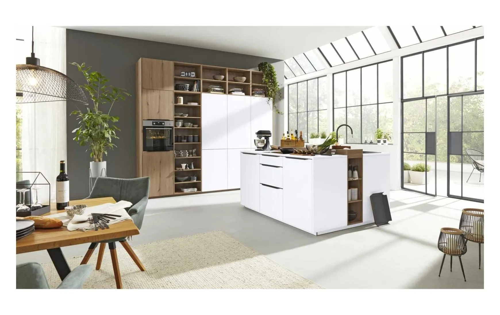 Topmoderne Einbauküche in Lacklaminat arcticweiß kombiniert mit Elementen in Vulkaneich Nachbildung, ca. 305+185×150 cm. Elektrogeräte, Sessel, Einbauspüle und Armatur gegen Mehrpreis. Andere Größen und Zusammenstellungen zum individuellen Preis planbar.