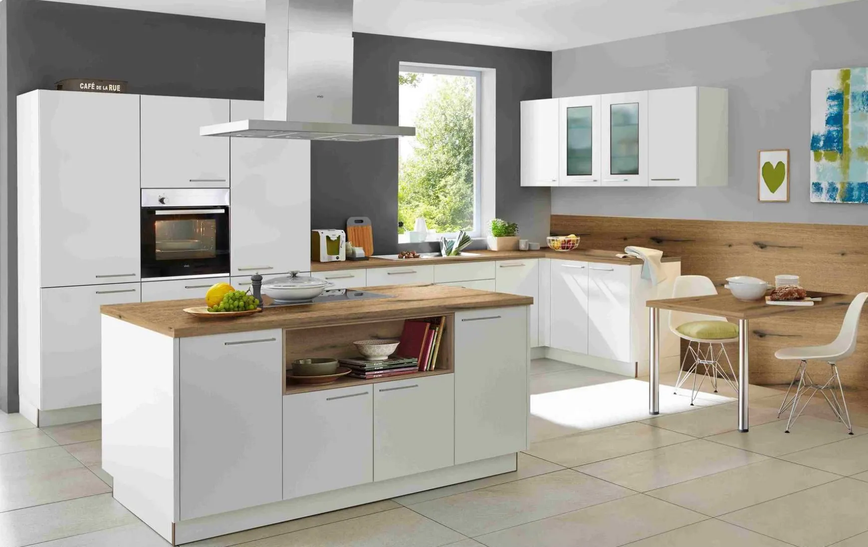 Moderne Einbauküche in Lacklaminat weiß mit Absetzungen in Vulkaneiche Nachbildung, ca. 505×200 + 185 cm, inkl. Elektrogeräte-Set, Nischenverkleidung mit Ansatztisch und Einbauspüle. Geschirrspüler, Stühle, Beleuchtung und Armatur gegen Mehrpreis. Andere Größen, Farben und Zusammenstellungen zum individuellen Preis planbar.