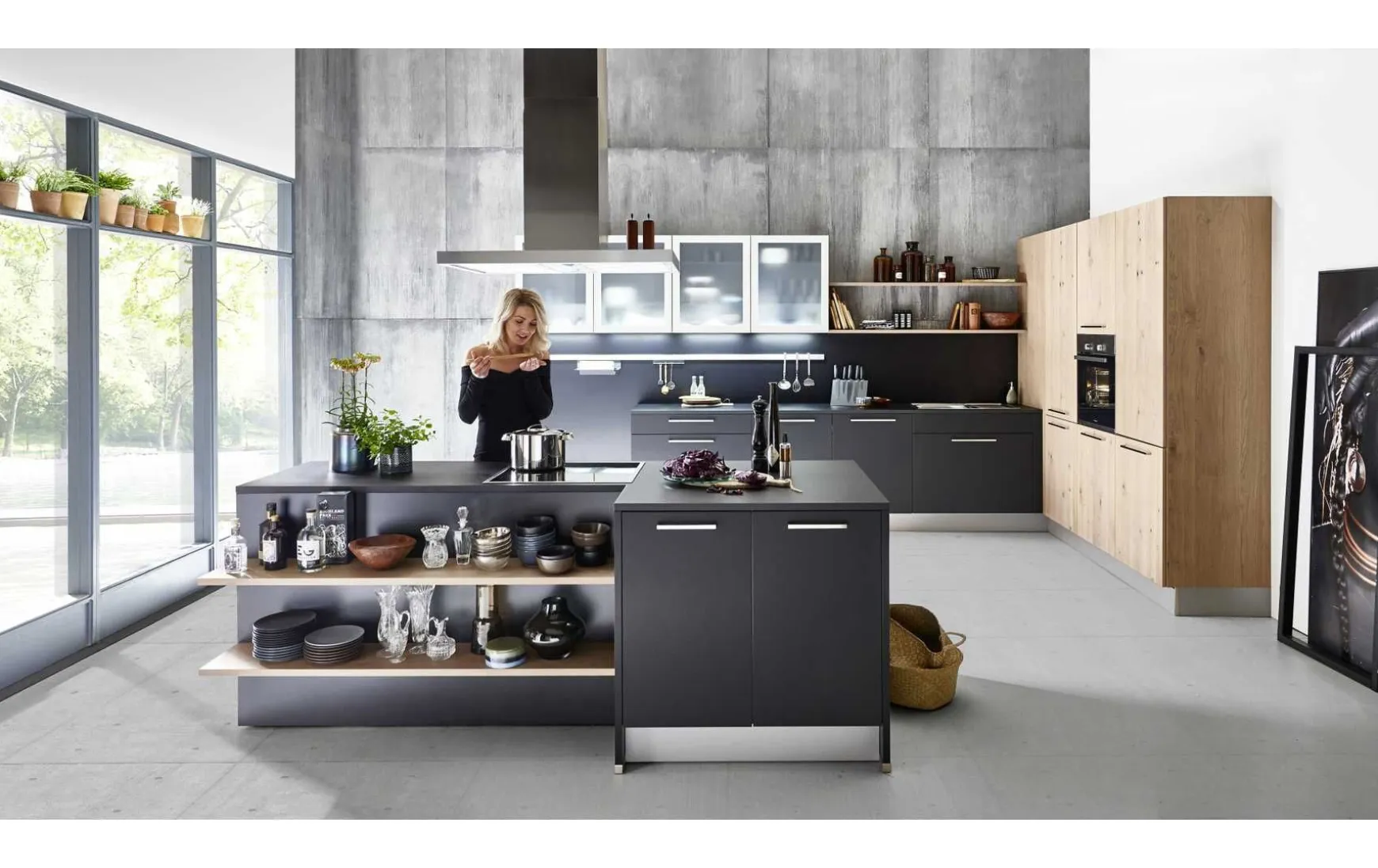 Elegante Einbauküche in schwarz softmatt kombiniert mit Eiche Pinot Nachbildung, ca. 455 x 245 + 245 cm, inkl. Elektrogeräte-Set und Einbauspüle. Geschirrspüler, Nischenrückwand, Wandboards und Armatur gegen Mehrpreis. Andere Größen und Zusammenstellungen zum individuellen Preis planbar.