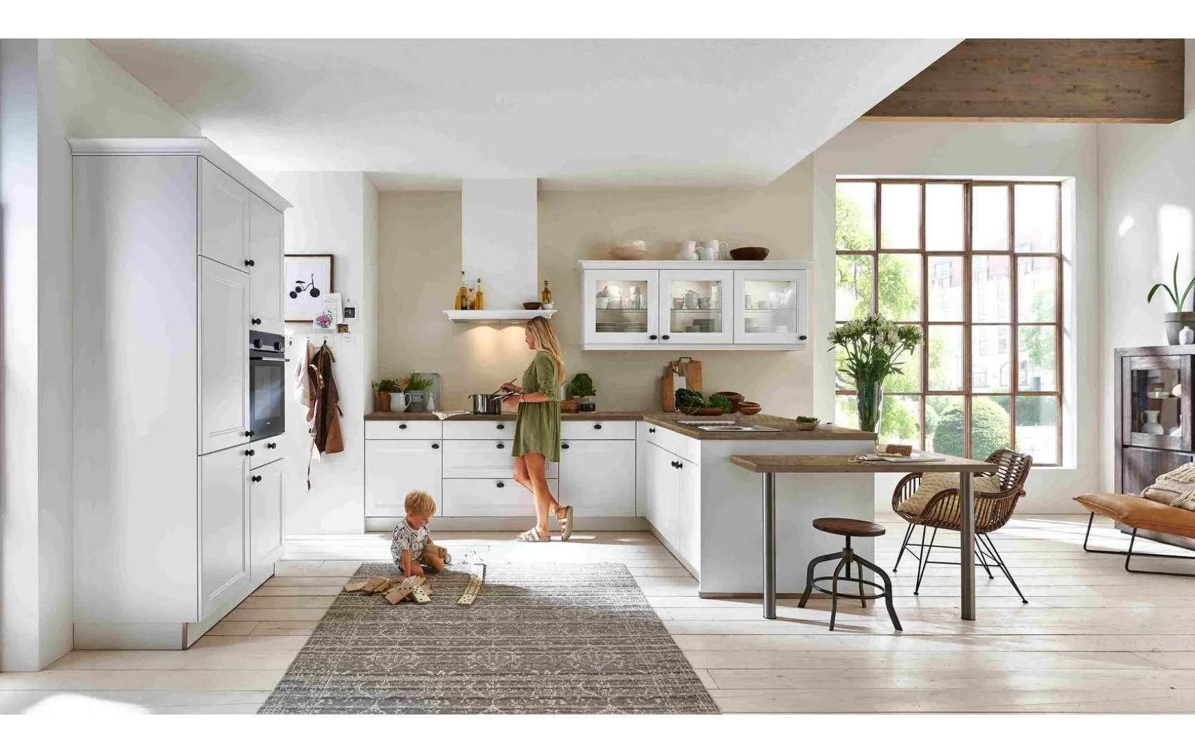 Moderne Landhausküche Echtlack weiß softmatt mit Arbeitsplatte und Ansatztisch in Eiche Barrique Nachbildung, ca. 120 + 335 x 259 cm, inkl. Elektrogeräte-Set und Einbauspüle. Geschirrspüler, Beleuchtung, Stuhl, Hocker und Armatur gegen Mehrpreis. Andere Größen, Farben und Zusammenstellungen zum individuellen Preis planbar.