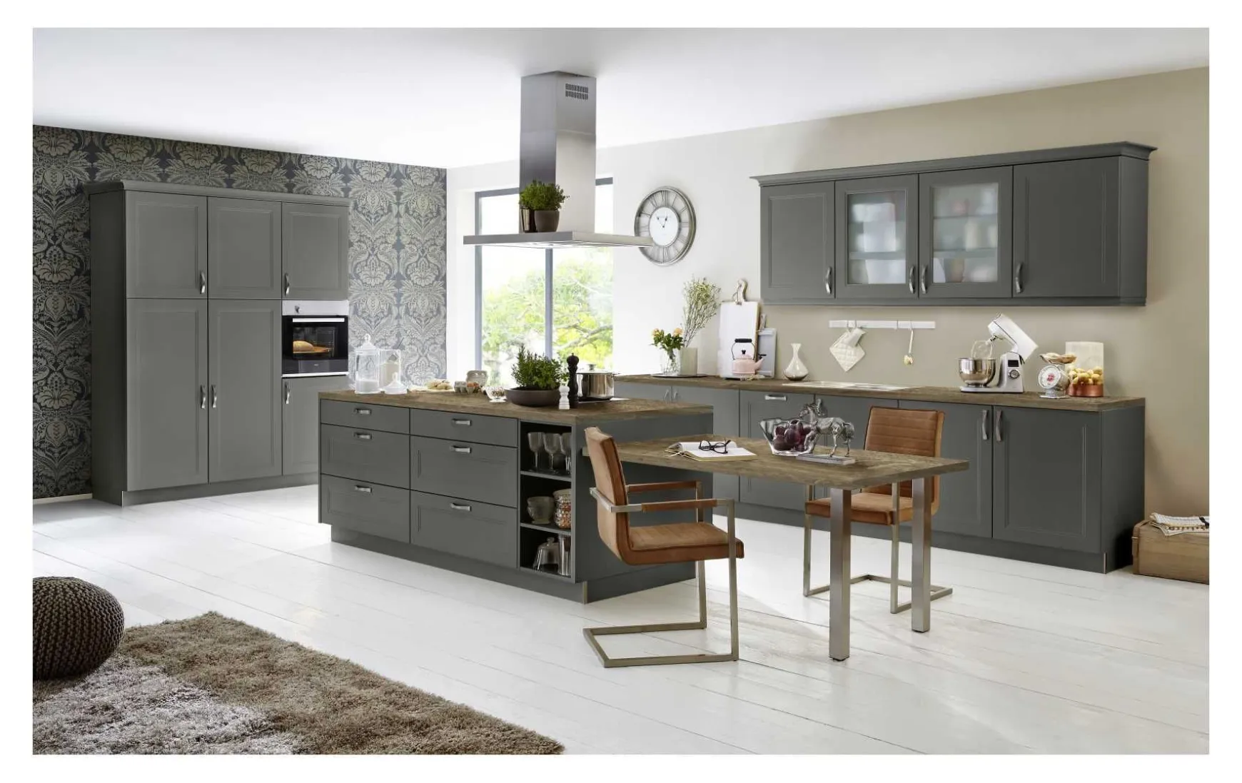 Elegante Landhausküche in Echtlack quarzgrau softmatt kombiniert mit Arbeitsplatten und Ansatztisch in Eiche Barrique Nachbildung, ca. 180 + 360 + 375 cm, inkl. Elektrogeräte-Set und Einbauspüle. Geschirrspüler, Relingset, Beleuchtung und Armatur gegen Mehrpreis. Andere Größen und Zusammenstellungen zum individuellen Preis planbar.