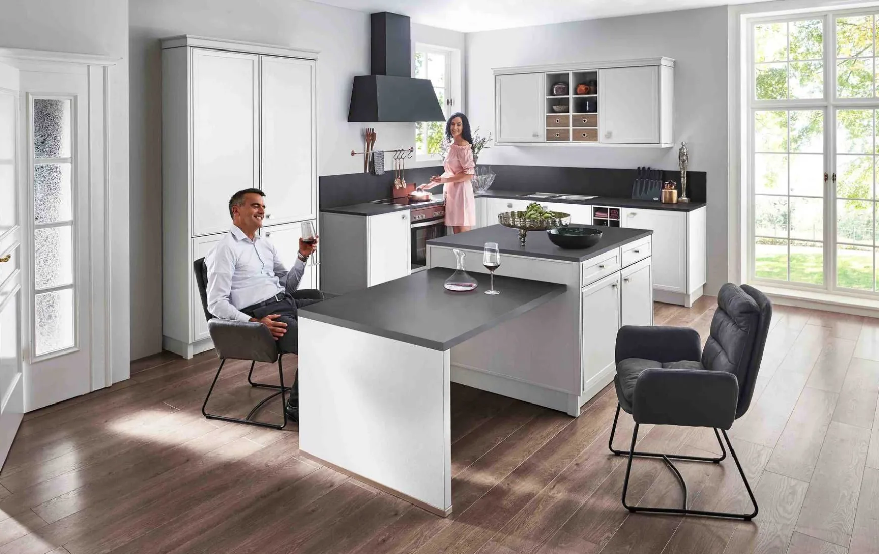 Elegante Landhausküche in Echtlack weiß softmatt kombiniert mit Arbeitsplatte, Frühstückstischplatte und Nischenpaneele in Schwarz Pro, ca.120 + 248 x 278 + 245 cm inkl. Elektrogeräte-Set und Einbauspüle. Geschirrspüler, Sessel, Beleuchtung und Armatur gegen Mehrpreis. Andere Größen, Farben und Zusammenstellungen zum individuellen Preis planbar.