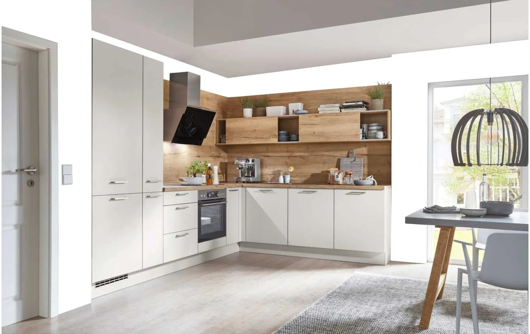 Moderne Einbauküche in seidengrau kombiniert mit Eiche Sierra Nachbildung, ca.305x245cm. Elektrogeräte, Spüle, Armatur und Essgruppe gegen Mehpreis erhältlich. Andere Größen und Zusammenstellungen zum individuellen Preis planbar.