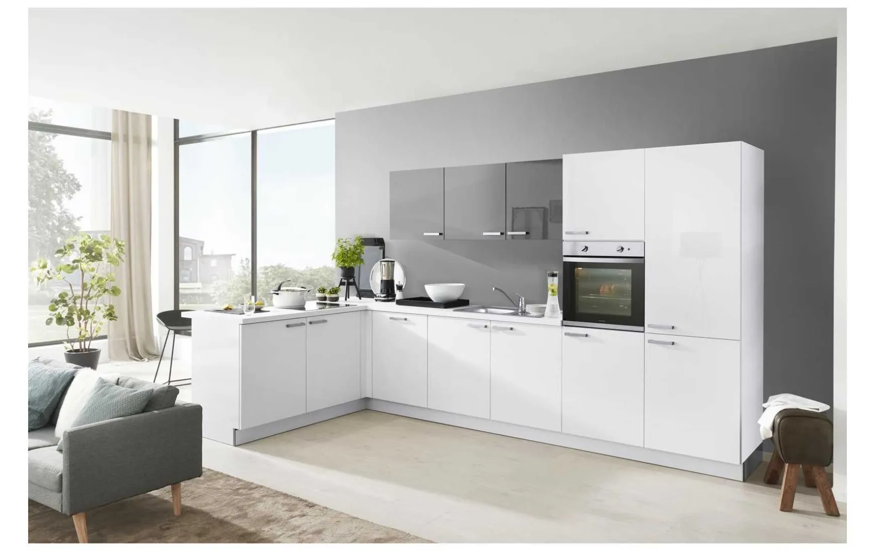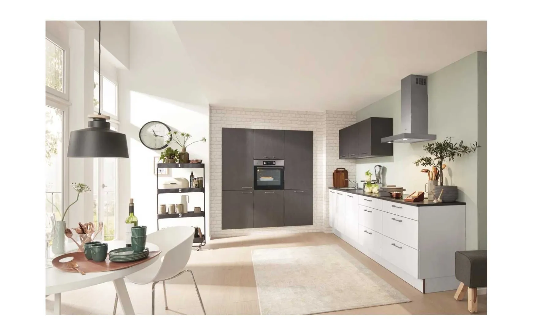Topmoderne Einbauküche in weiss softmatt kombiniert mit Arbeitsplatte, Hochschrankelement und Hängern in Stahlgrau, ca. 180+315cm. Ekelektrogeräte, Einbauspüle und Armatur gegen Mehrpreis. Andere Größen und Zusammenstellungen zum individuellen Preis planbar.