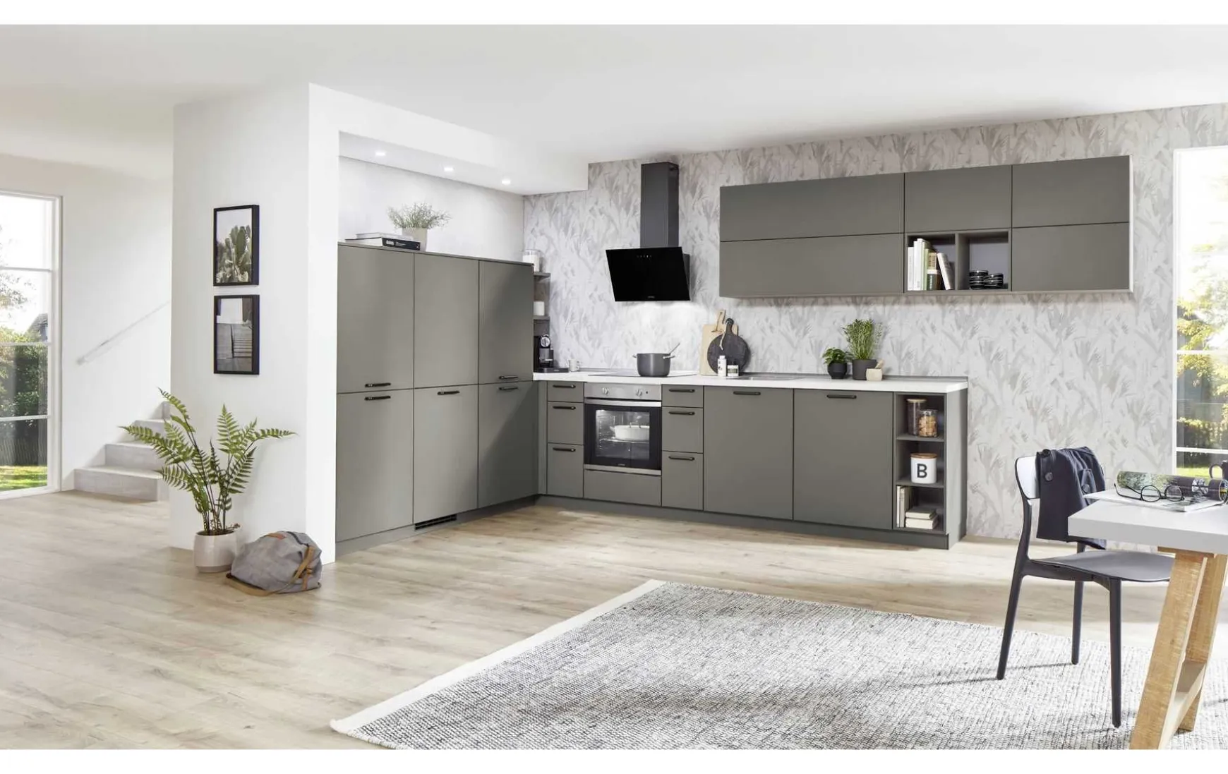 Moderne Einbauküche in Taupegrau besticht durch ihre topmoderne Hängeschrankkombination und die praktische Ecklösung ca. 245x425cm. Elektrogeräte, Beleuchtung, Spüle und Armatur gegen Mehrpreis erhältlich. Andere Größen, Farben und Zusammenstellungen zum individuellen Preis planbar.