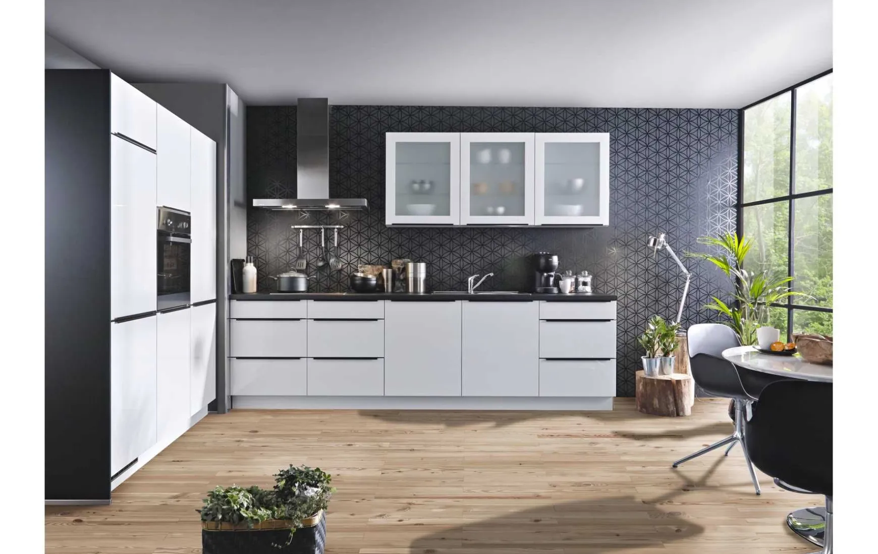 Moderne Einbauküche in schwarz mit Fronten in Lack weiß Hochglanz, ca. 180 + 300 cm, inkl. Elektrogeräte-Set und Einbauspüle. Geschirrspüler, Relingset und Armatur gegen Mehrpreis. Andere Größen und Zusammenstellungen zum individuellen Preis planbar.