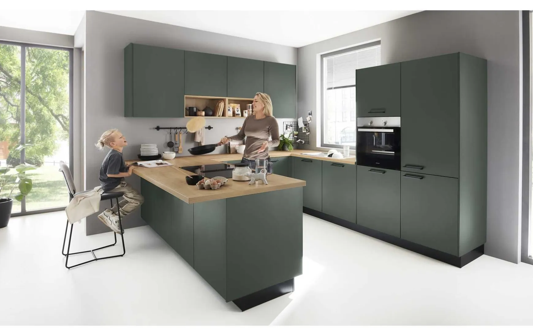 Topmoderne Einbauküche in Lack weiß softmatt kombiniert mit Lack Avocado softmatt, ca.267 x 350cm, inkl. Elektrogeräte-Set und Einbauspüle. Geschirrspüler, Essgruppe und Armatur gegen Mehrpreis erhältlich. Andere Größen und Zusammenstellungen zum individuellen Preis planbar.