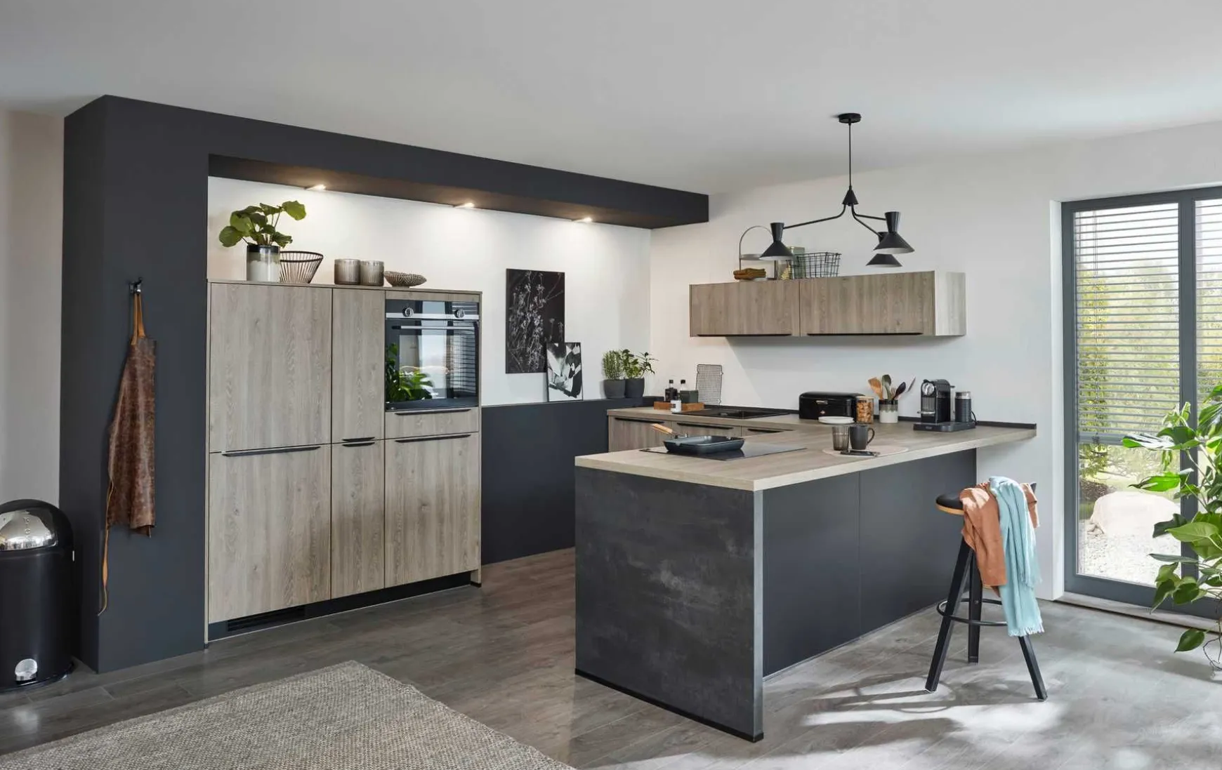 Moderne Einbauküche in Schwarzbeton Nachbildung kombiniert mit Eiche Bergamo Nachbildung, ca.150+270x245cm. Elektrogeräte, Spüle, Armatur und Hocker gegen Mehpreis erhältlich. Andere Größen und Zusammenstellungen zum individuellen Preis planbar.
