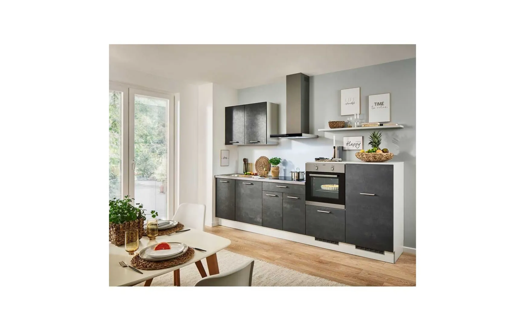Moderne Einbauküche in lichtgrau kombiniert mit Fronten in Beton graphitgrau Nachbildung und Arbeitsplatte in Beton perlgrau Nachbildung, inkl. Elektrogeräte-Set und Einbauspüle. Geschirrspüler und Armatur gegen Mehrpreis erhältlich. Andere Größen und Zusammenstellungen zum individuellen Preis planbar.