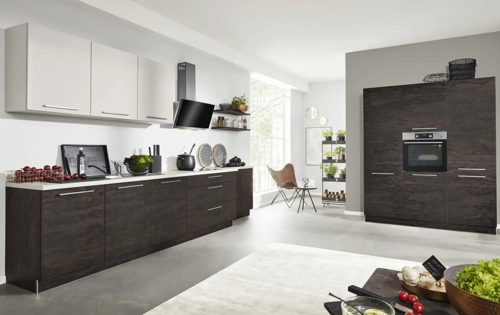Moderne Einbauküche in Eiche geflämmt Nachbildung kombiniert mit Hänger und Arbeitsplatte in Sahara, ca. 390+180cm. Elektrogeräte, Wandboards, Sessel, Einbauspüle und Armatur gegen Mehrpreis. Andere Größen und Zusammenstellungen zum individuellen Preis planbar.