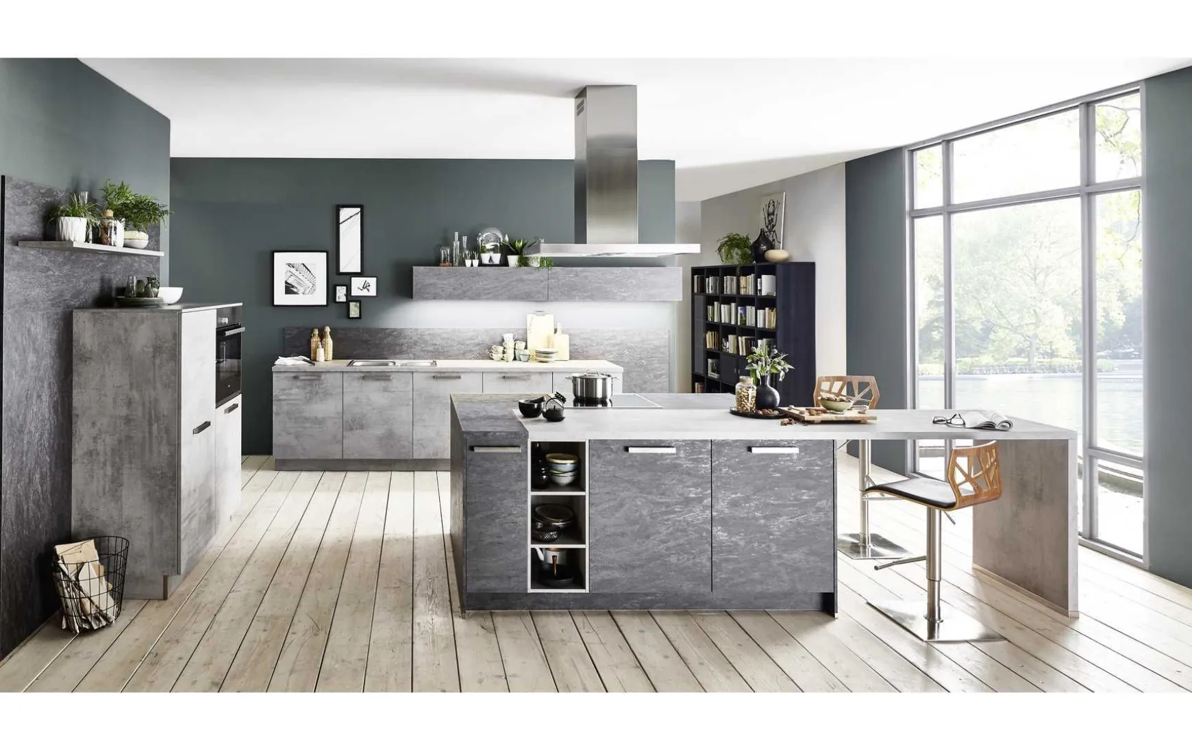 Die Insel in der Absetzung Basalt wird von einem Highboard in der Breite 120 cm und den Unterschränken im hinteren Bereich unterstützt. Durch eine Ausklinkung wird die Arbeitsplatte in zwei Farben geteilt, und auf der Seite hinausgezogen, um einen Essplatz zu schaffen. Natürlich dürfen Hänge- Klappschränke nicht fehlen. Hier in einer schlanken und sehr modernen Ausführung in Beton.
