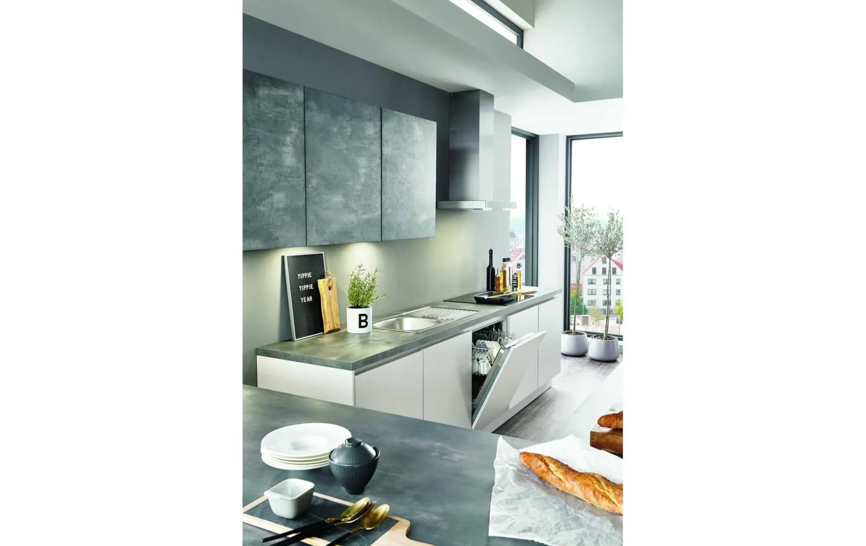 - Nicht im Preis enthalten: Abgebildete Dekoration, Geschirrspüler, Kohlefilter und Armatur