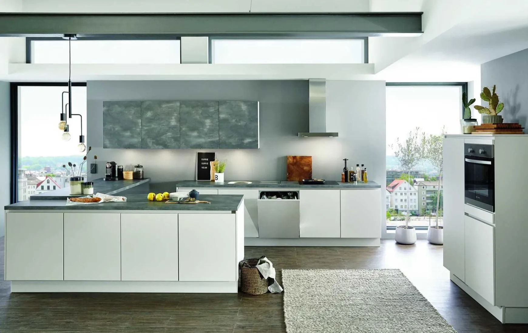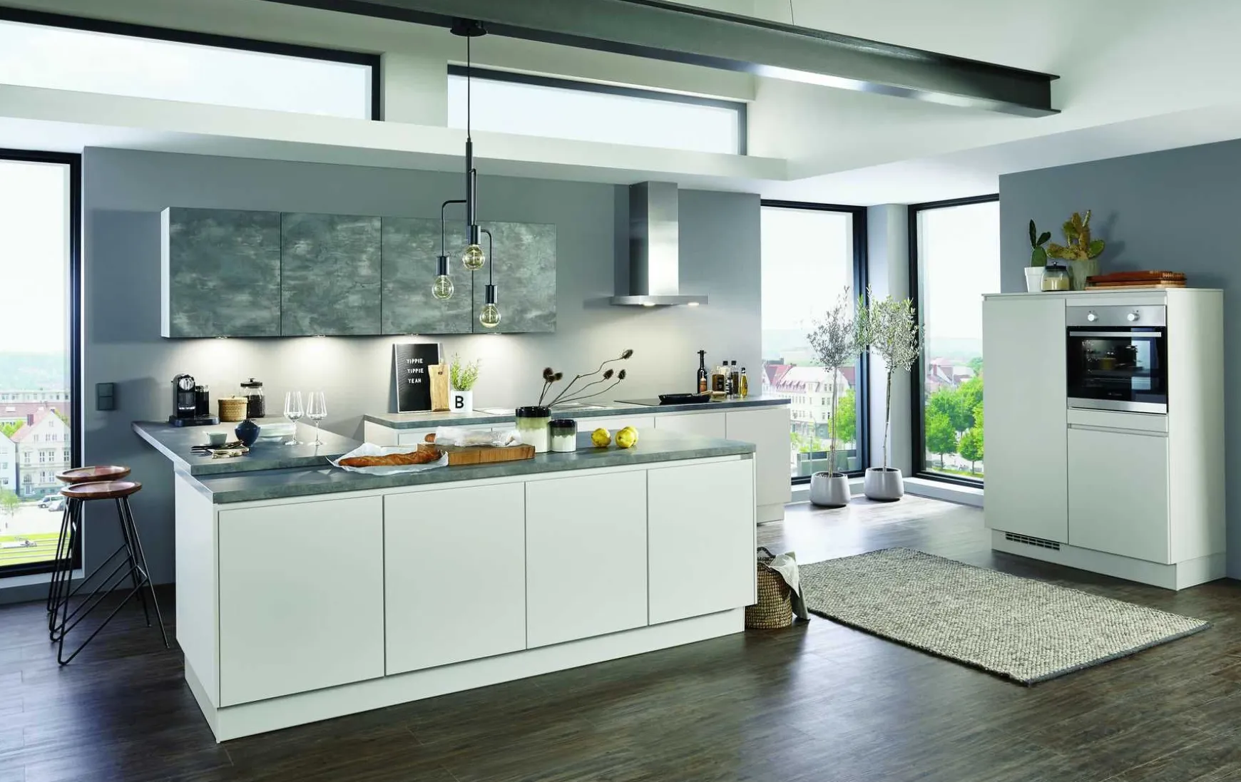 Mit dieser Inselküche in der modernen grifflosen Ausführung, beweisen Sie Trendbewusstsein und Ihre hohen Ansprüche an Funktionalität und Alltagstauglichkeit. Mit besonderen Extras wie einem Backofen in ergonomischer Höhe, einer dekorativen Sideboardlösung und Hängeschränken in moderner Betonoptik machen Sie Ihre Küche zum Mittelpunkt Ihrer Wohnung.