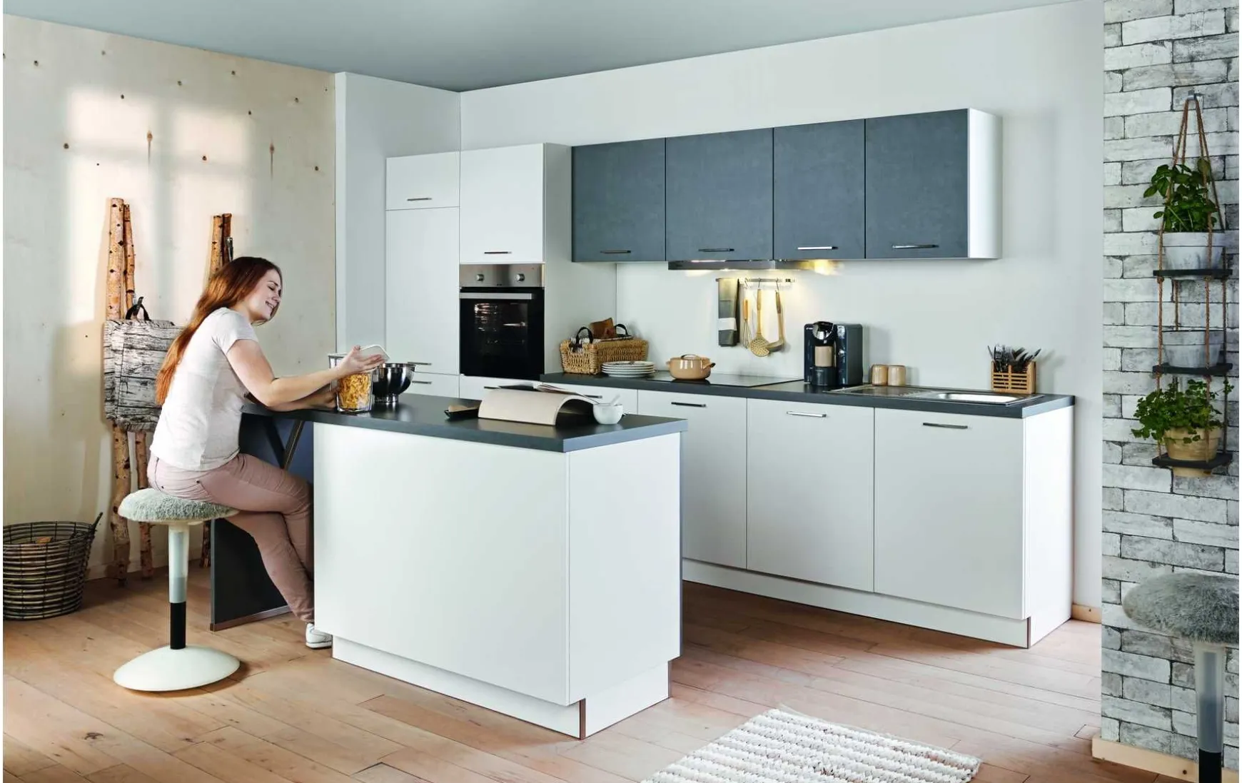 Moderne Einbauküche in Lacklaminat weiß matt kombiniert mit Absetzungen in Stahl dunkel Nachbildung, ca. 360 + 185 cm, inkl. Elektrogeräte-Set und Einbauspüle. Geschirrspüler, Beleuchtung, Hocker und Armatur gegen Mehrpreis. Andere Größen und Zusammenstellungen zum individuellen Preis planbar.