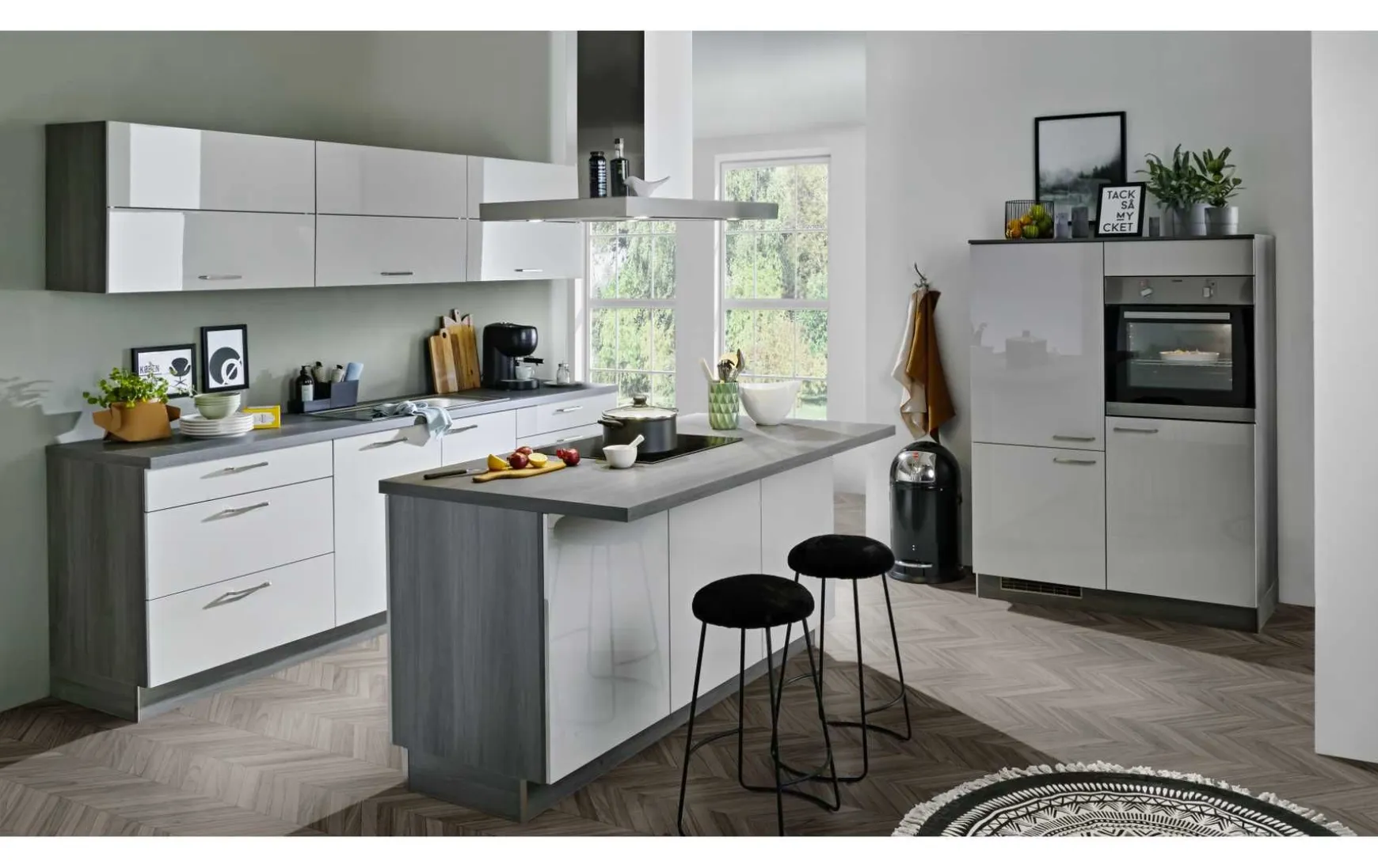 Moderne Inselküche in Lacklaminat hellgrau Hochglanz kombiniert mit Korpus und Arbeitsplatten in Eiche Grau Nachbildung, ca.270+120+180cm, inkl. Elektrogeräte-Set und Einbauspüle. Geschirrspüler, Hocker und Armatur gegen Mehrpreis. Andere Größen und Zusammenstellungen zum individuellen Preis planbar.