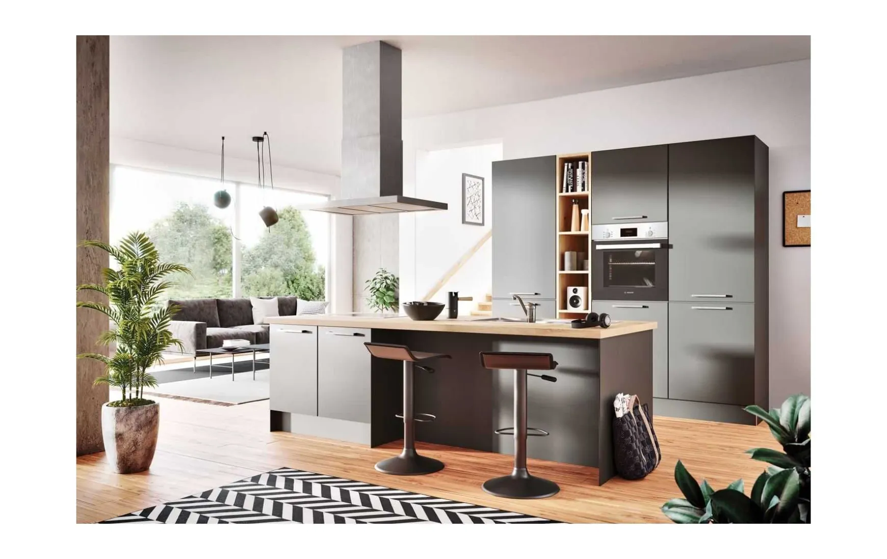 Moderne Einbauküche in Lack Umbra kombiniert mit Arbeitsplatte und Regal in Eiche Nachbildung ca. B: 210 + Insel mit Frühstüksbar ca. 244x99cm. Elektrogeräte -Set, Einbauspüle, Armatur und Hocker gegen Mehrpreis. Anderen Farben, Größen und Zusammenstellungen zum individuellen Preis planbar.