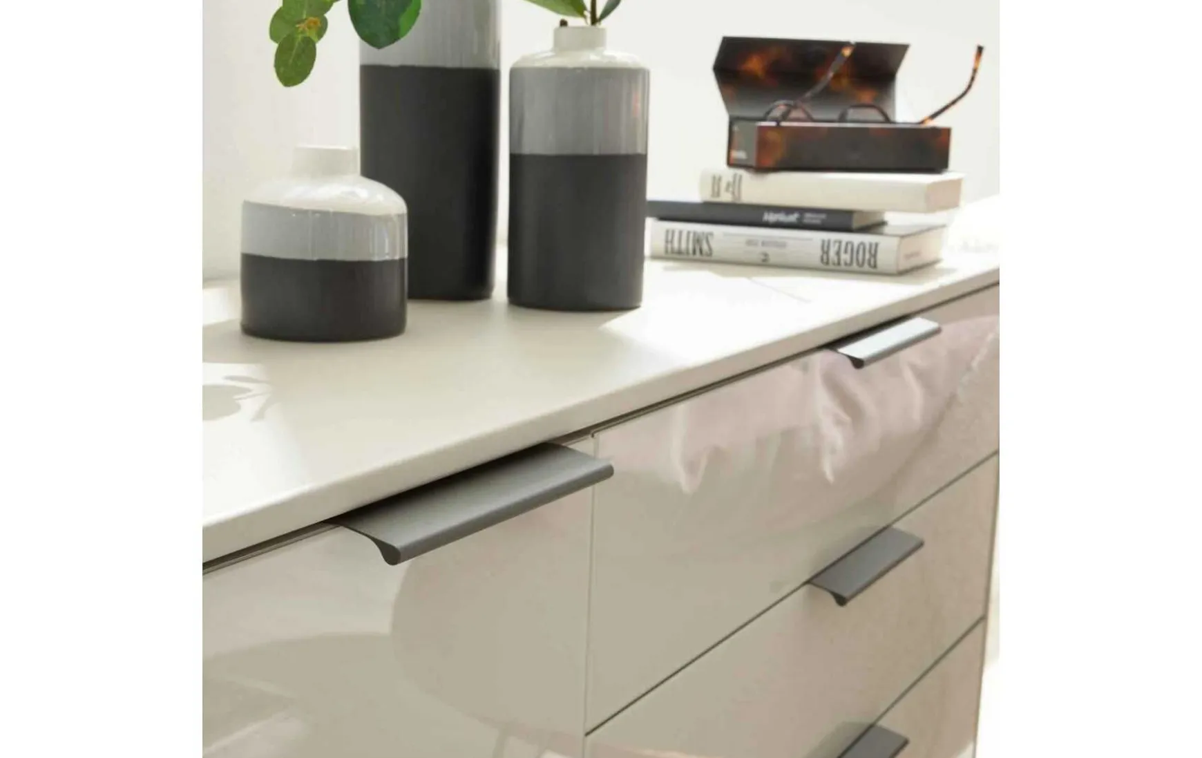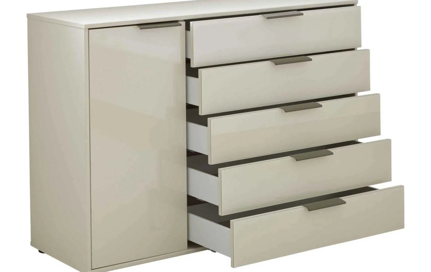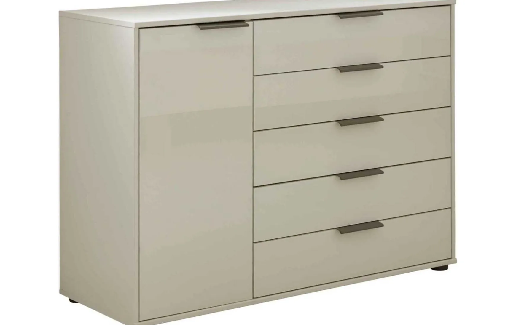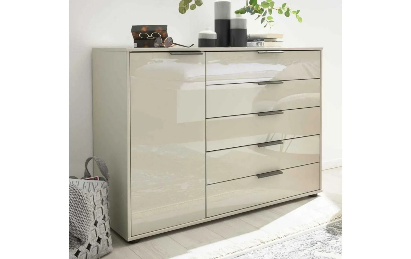 Die Kombikommode aus der hochwertigen Serie kombiniert champagnerfarbene Glasfronten mit einem ebenso champagnerfarbenen Korpus. Schieferfarbene Metallgriffe runden das Design harmonisch ab. Durch die perfekt aufeinander abgestimmten Farben strahlt die Kommode moderne Eleganz aus. Innen sorgt silbergraues Streifendekor für das gewisse Etwas. In den fünf geräumigen Schubladen und hinter der Tür mit Türdämpfung und einem höhenverstellbaren Boden haben Sie jede Menge Stauraum für diverse Textilien – von Unterwäsche bis hin zu Bettwäsche und Handtüchern bringen Sie einiges unter. Zudem können Sie den Oberboden als Ablage für Deko nutzen. Die Maße der Herrenkommode belaufen sich auf ca. 120 x 86 x 43 cm (BxHxT).