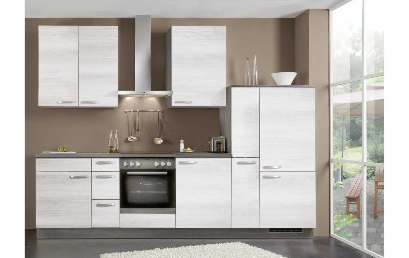 Moderne Einbauküche in Eiche grau Nachbildung kombiniert mit Fronten in Eiche weiß Nachbildung, ca.300cm. Elektrogeräte, Spüle und Armatur gegen Mehrpreis erhältlich. Andere Größen und Zusammenstellungen zum individuellen Preis planbar.