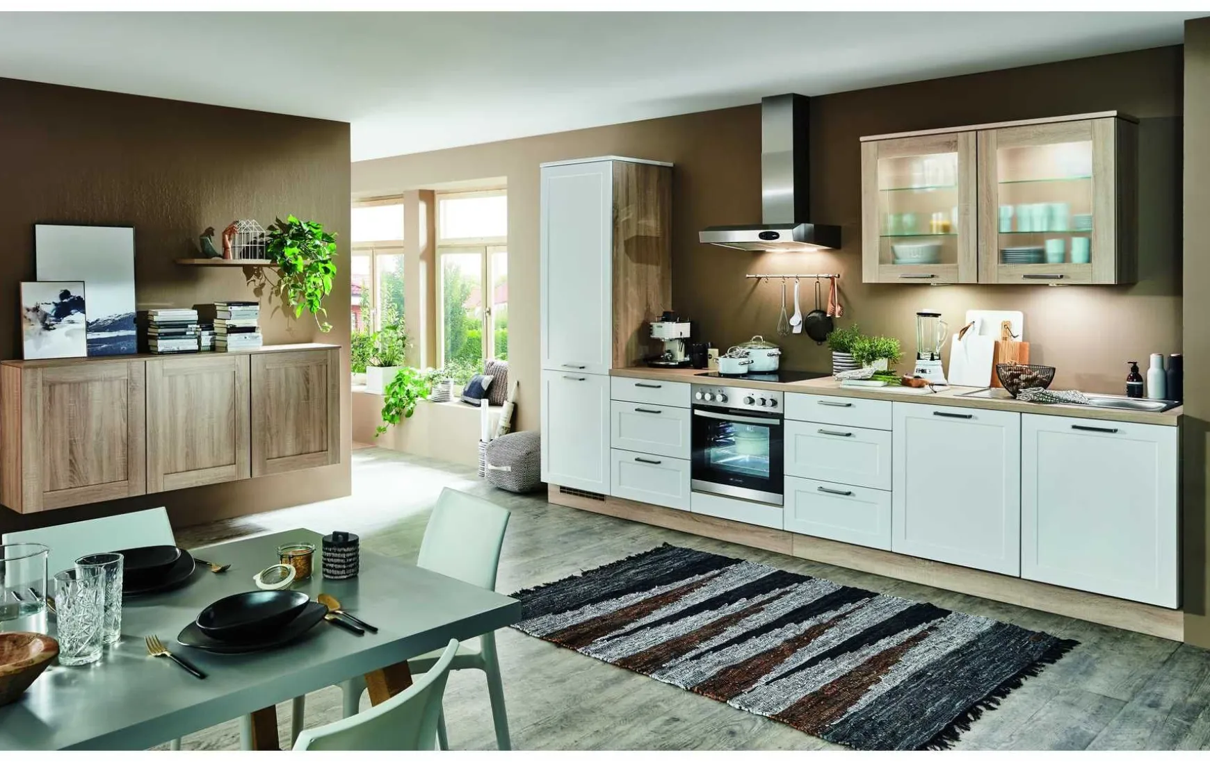 Für Sie ist die Küche nicht nur ein Ort zum Arbeiten, sondern auch zum Entspannen? Hier treffen sich freundliches Design und funktionale Ausstattung. Das Modell ist als praktische Küche mit einer belüfteten oberen Reihe und einzigartigen hängenden Sideboards konzipiert. Der vordere Teil der unteren Reihe und des hohen Seitenschranks nimmt elegantes Alpinweiß mit einem dekorativen Kassettenauftritt an. Korpus, Arbeitsplatte und die Oberschränke sorgen durch ihre Eiche Sierra Nachbildung für natürliches Flair. Das hängende Sideboard mit Wandregal übernimmt ebenfalls dieses natürliche Dekorationsdesign. Die Glasrahmentür macht das Erscheinungsbild modischer. In der Küche und im Wohnzimmer hat die Funktion oberste Priorität. In Sideboards, Wandschränken und Schubladen ist ausreichend Stauraum vorhanden. Sie können Ihren persönlichen Stil auch beherzt ausleben, schließlich können Sie die Oberseite des Sideboards perfekt verwenden, um eine kleine Dekoration zu setzen Natürlich ist auch das gesamte Geräte-Set Teil des Konzepts. Kurz gesagt, die Zeilenküche kombiniert den Komfort des Wohnbereichs mit den Funktionen der Küche und bereichert so Ihr Zuhause.