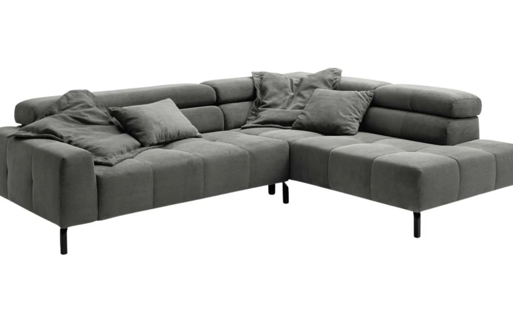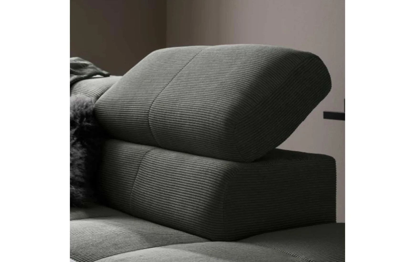 Diese moderne Polsterecke vereint stilvolles Design mit durchdachtem Komfort. Der hochwertige Feincord-Bezug im eleganten Farbton Olive verleiht dem Sofa eine trendbewusste, wohnliche Ausstrahlung und macht es zum Blickfang im Wohnzimmer. Die schwarzen Metallfüße unterstreichen den modernen Charakter und sorgen für einen stabilen Stand. Für maximalen Komfort verfügt die Polsterecke über eine praktische Kopfteilverstellung, die individuell angepasst werden kann. Der manuelle Sitzvorzug ermöglicht es zudem, die Sitzfläche im Handumdrehen zu erweitern – ideal für entspannte Abende oder gemütliche Stunden mit Familie und Freunden. Der komfortable Sandwichaufbau im Sitz sorgt für eine ausgewogene Kombination aus Stabilität und Bequemlichkeit. Mit der Armlehne auf der rechten Seite eignet sich das Sofa perfekt für moderne Wohnkonzepte und offene Raumgestaltungen.